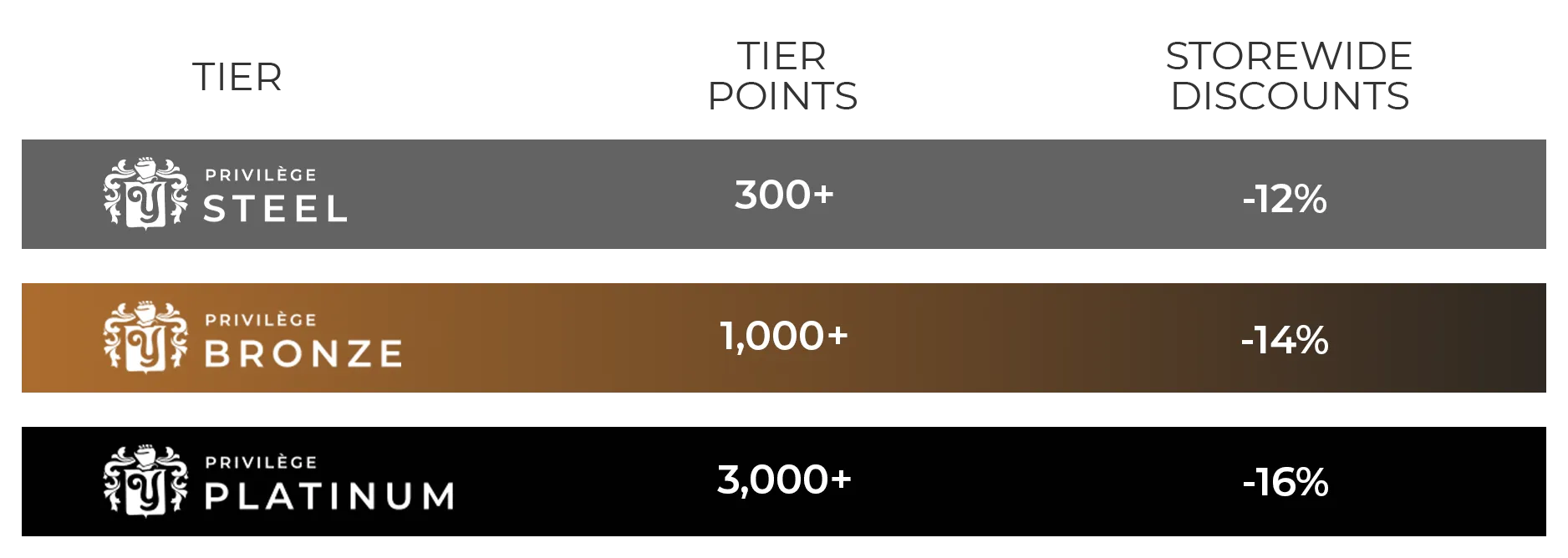 Sobald Sie einen Treuestatus erreicht haben, erhalten Sie für 2 Jahre unbegrenzten Zugang zu Ihren Statusvorteilen. Jedes Mal, wenn Sie einen Kauf tätigen, werden Ihre Statusvorteile automatisch um weitere 2 Jahre verlängert.