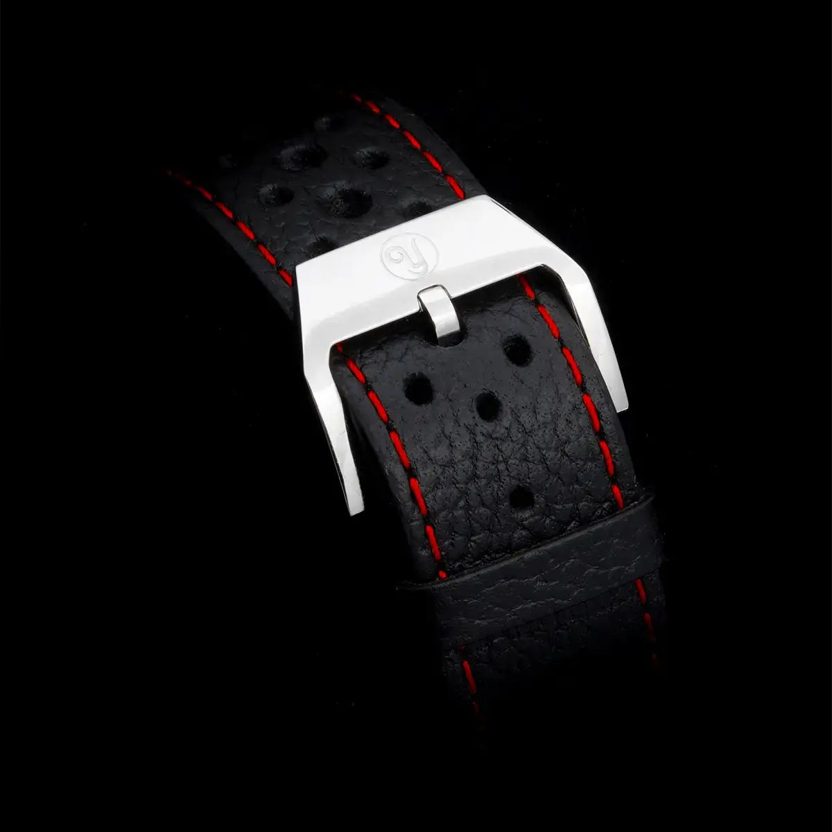 Das Rallye-Armband wurde von einem französischen Armband-Hersteller aus unserer Region (Franche-Comté) hergestellt und besteht aus genarbtem, perforiertem Leder mit orangefarbenen Steppnähten – passend zu den Zeigern. Die polierte Stahlschließe ist mit dem-YEMA Logo graviert.