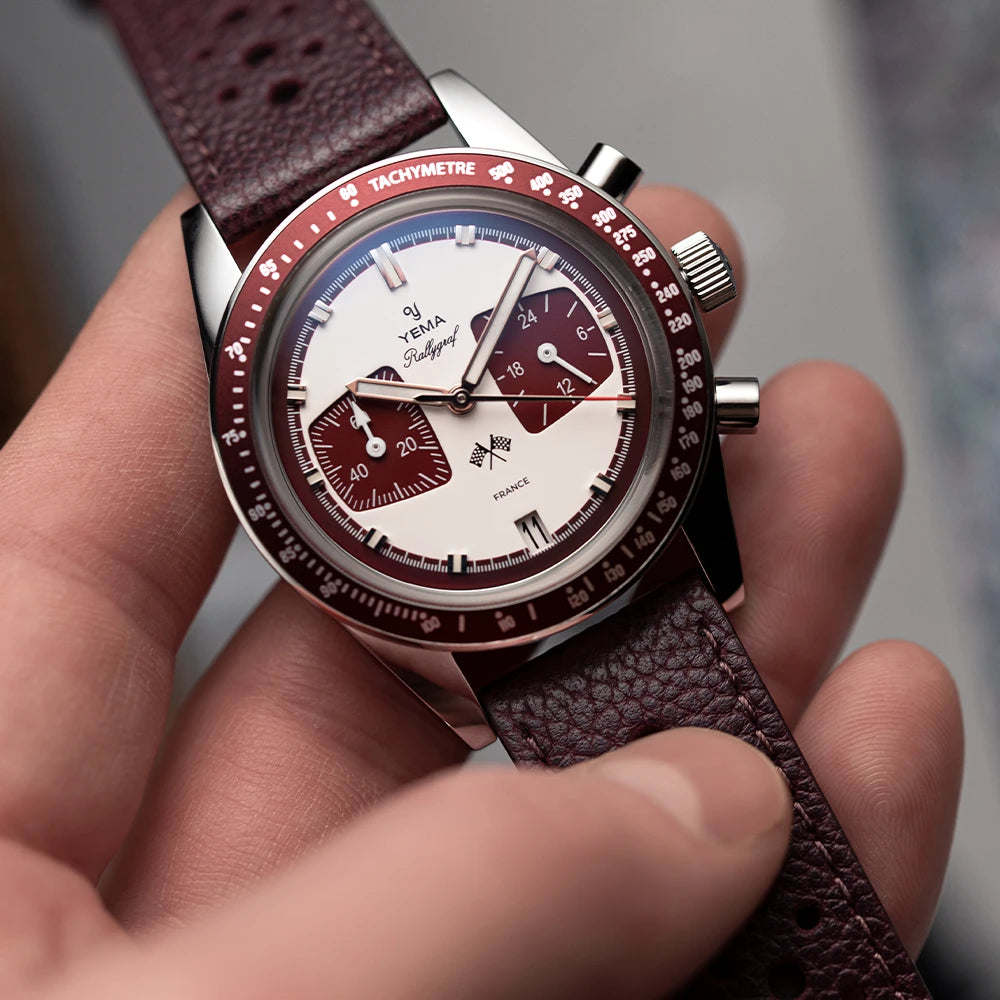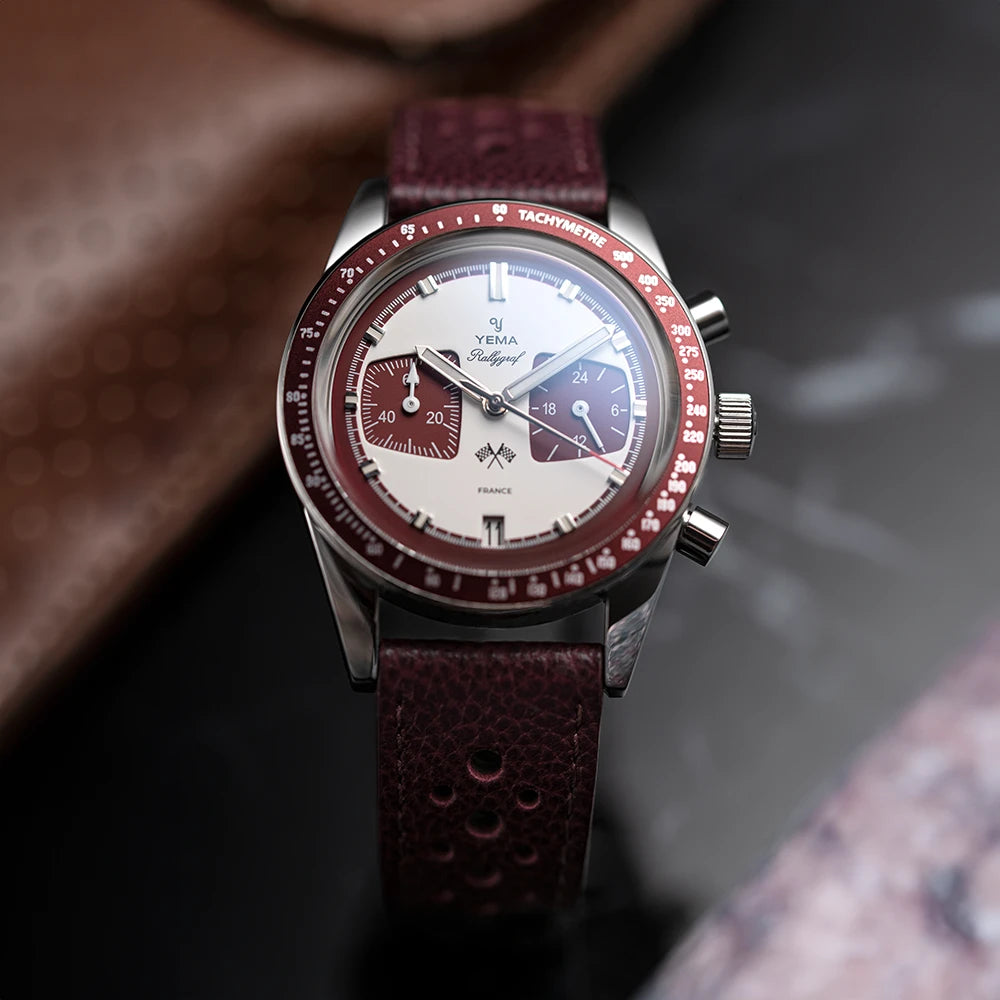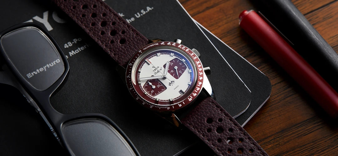 Die perforierten, genarbten Lederbänder wurden für Motorsport-Enthusiasten entwickelt und von einem französischen Hersteller aus unserer Region (Franche Comté) hergestellt. Die Armbänder sind von Oldtimer-Lenkrädern und Autofahrer-Handschuhen inspiriert und eignen sich perfekt im Zusammenspiel mit einem klassischen Chronographen.