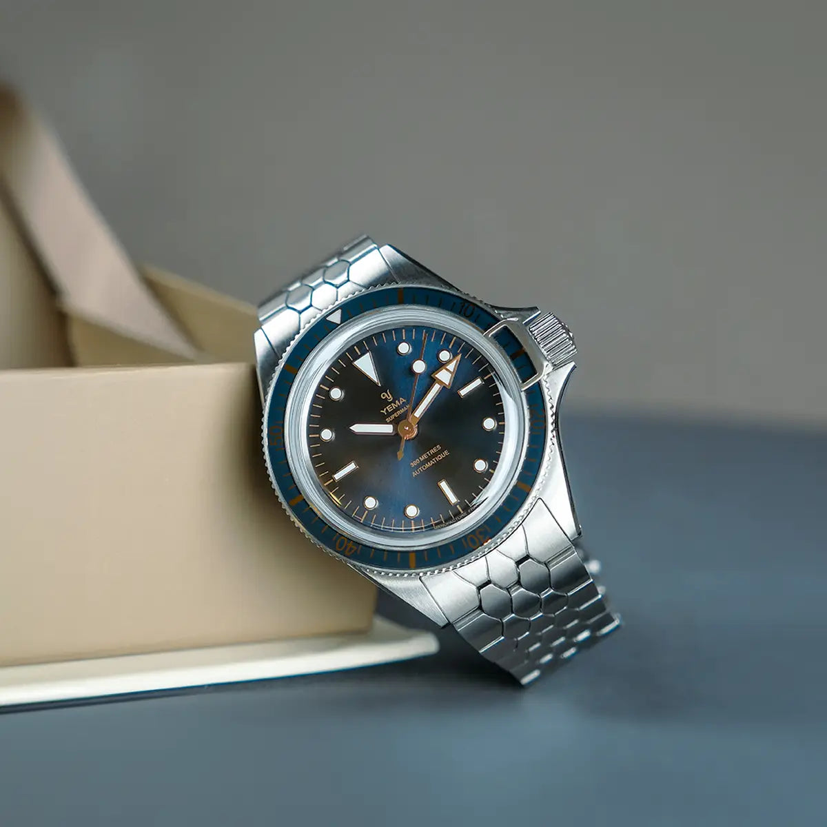 El cierre desplegable de acero 316L con sus acabados cepillados aporta estilo y comodidad. El logotipo YEMA está grabado en relieve en la parte superior y la mención MAISON HORLOGÈRE FRANÇAISE SINCE 1948 está grabada en la parte inferior de la hebilla. El brazalete tiene una extensión para poder ajustarlo fácil y rápidamente sobre un traje de buceo.