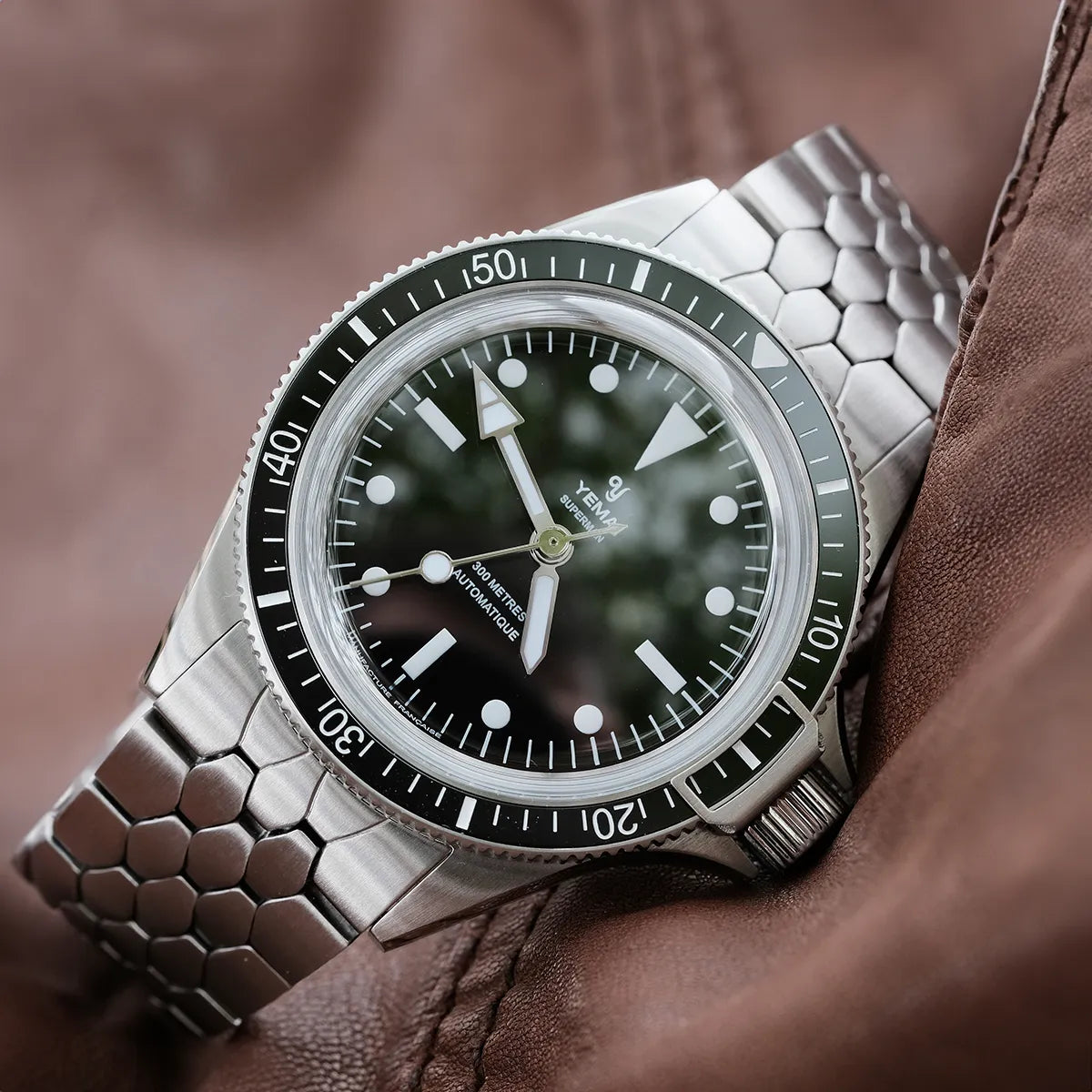 El emblemático brazalete Scales de YEMA de los años 60 ha adelgazado 0,40 mm para integrarse armoniosamente con la delgada caja del Superman.
