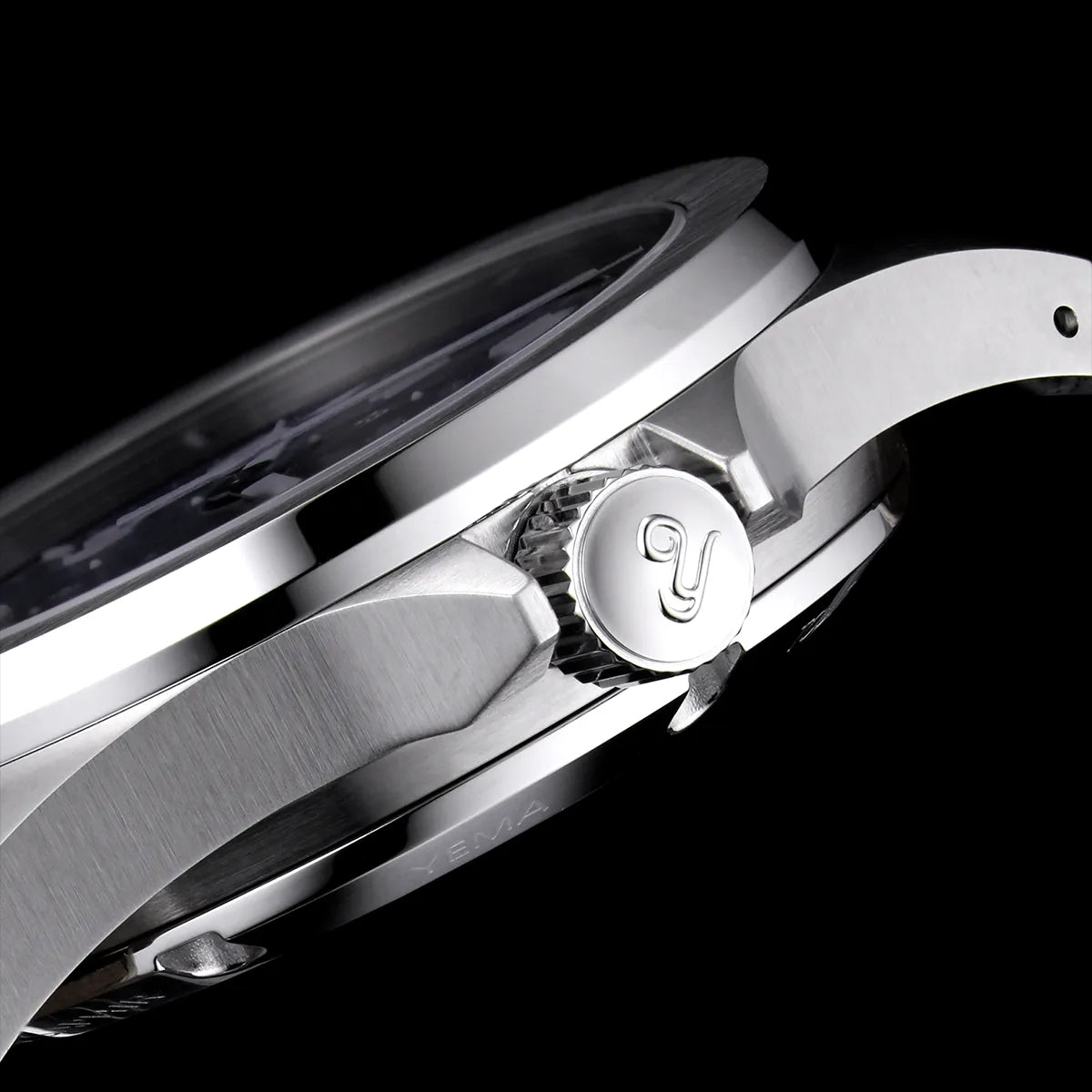 Elegantes protectores de corona cepillados y corona atornillada con el logotipo vintage de YEMA en relieve.