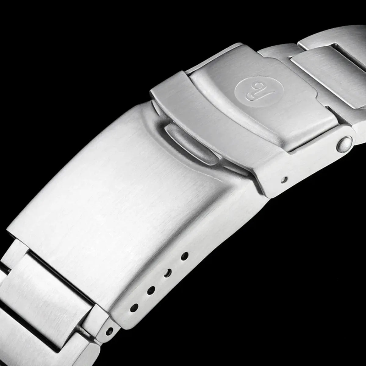 Gracias a su prominente bisel de acero cepillado, sus protectores de corona deportivos y su resistencia al agua de 300 metros, el Flygraf Pilot es un reloj-herramienta extremadamente versátil que acompañará a pilotos y observadores aficionados en todas sus aventuras aéreas y terrestres.
