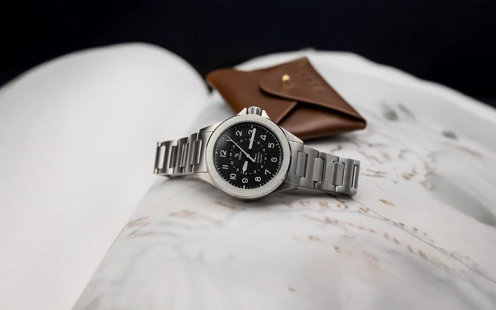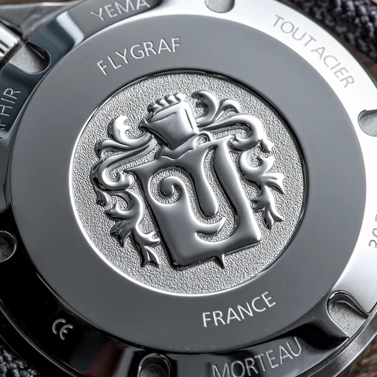 Diseñado en colaboración con el piloto acrobático profesional Sammy Mason, el Flygraf Pilot se inspira tanto en los relojes de Flieger como en los militares de la Segunda Guerra Mundial.