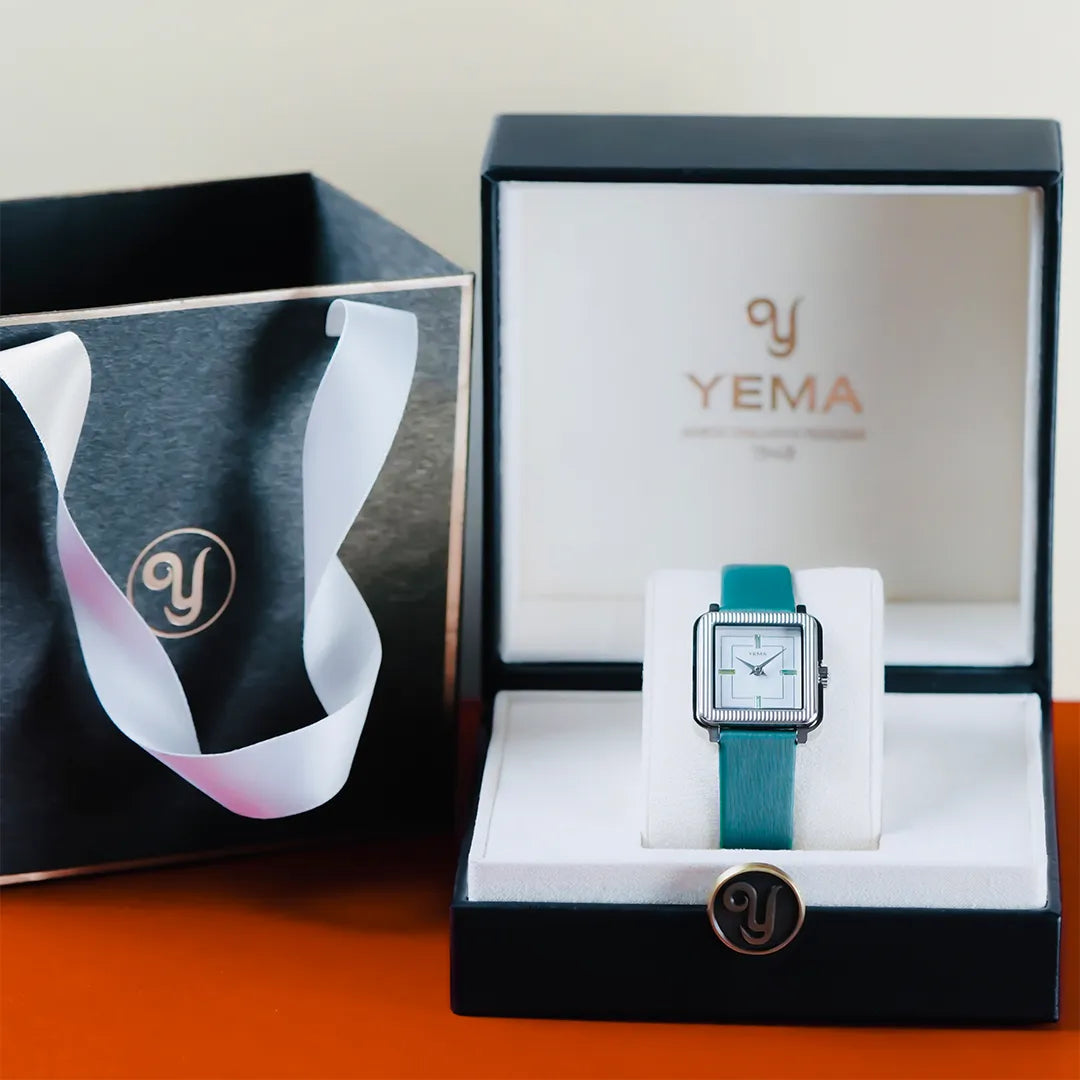 Cada reloj se entrega en una caja YEMA con una tarjeta de garantía internacional de 2 años hecha en piel y una bolsa YEMA con lazo, perfecta para regalo.