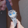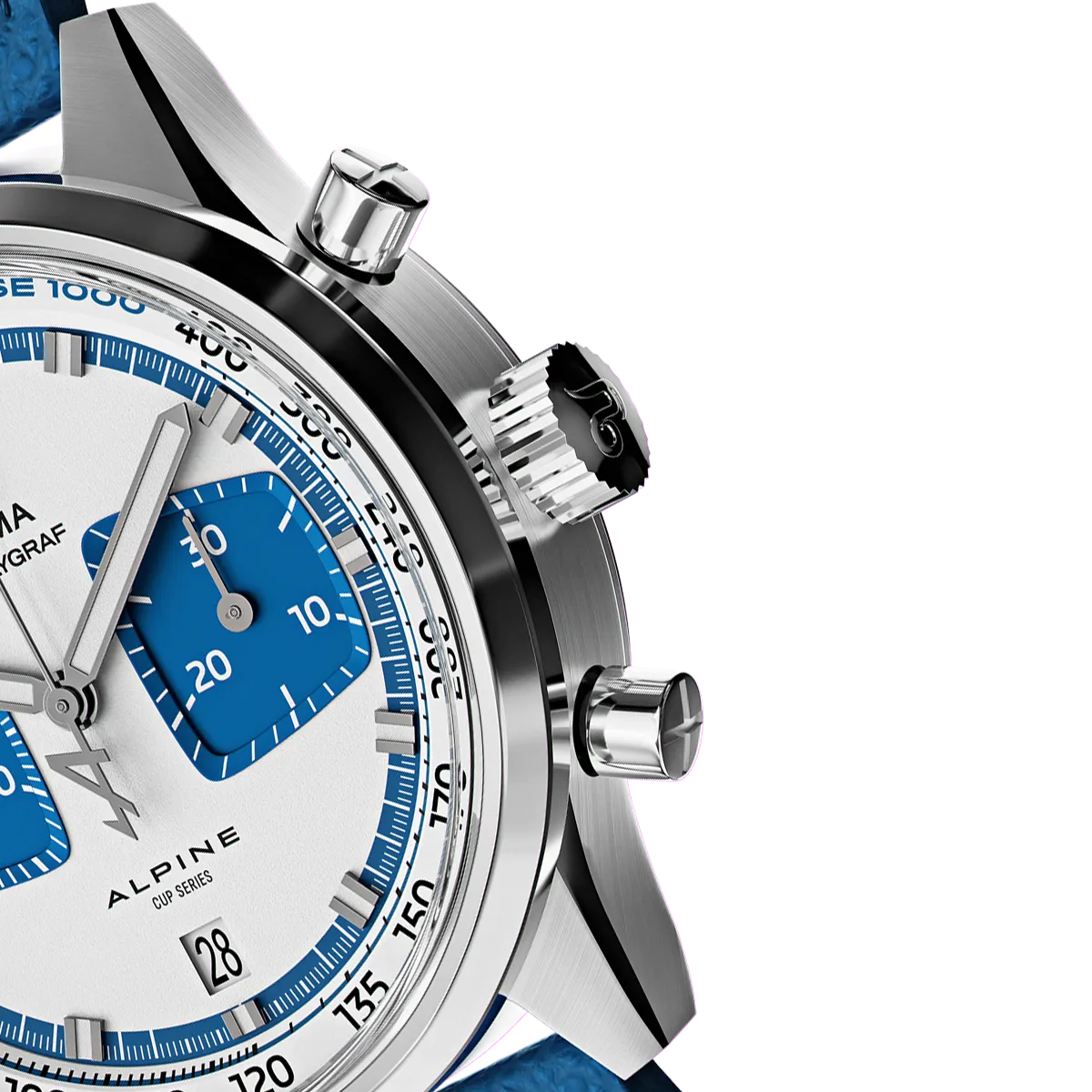 El diseño inmediatamente reconocible de los subcontadores de horas y minutos del cronógrafo está inspirado en los tableros de instrumentos de los coches de carreras vintage, un estilo popular entre los entusiastas y coleccionistas de relojes. Los icónicos subcontadores panda en azul Alpine resaltan en un fuerte contraste con la esfera blanca.