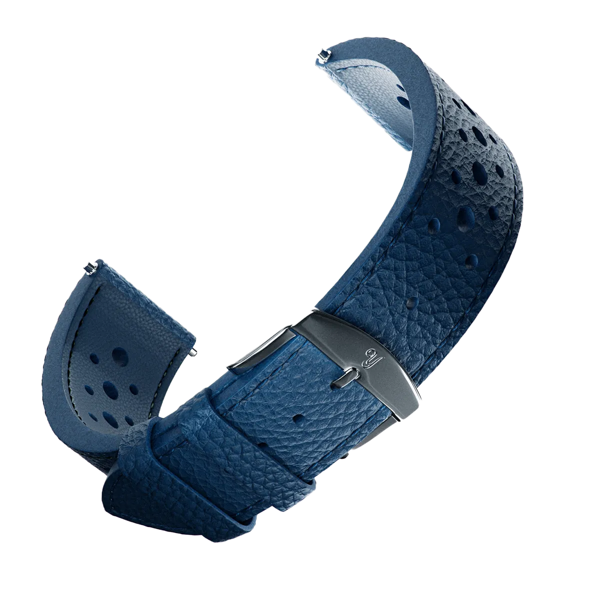 Fabricado por una manufactura francesa de nuestra región, este cinturón de piel azul granulada y perforada estilo Rally ha sido especialmente diseñado en los colores que combinan con la serie Alpine Elf Cup del Rallygraf.
