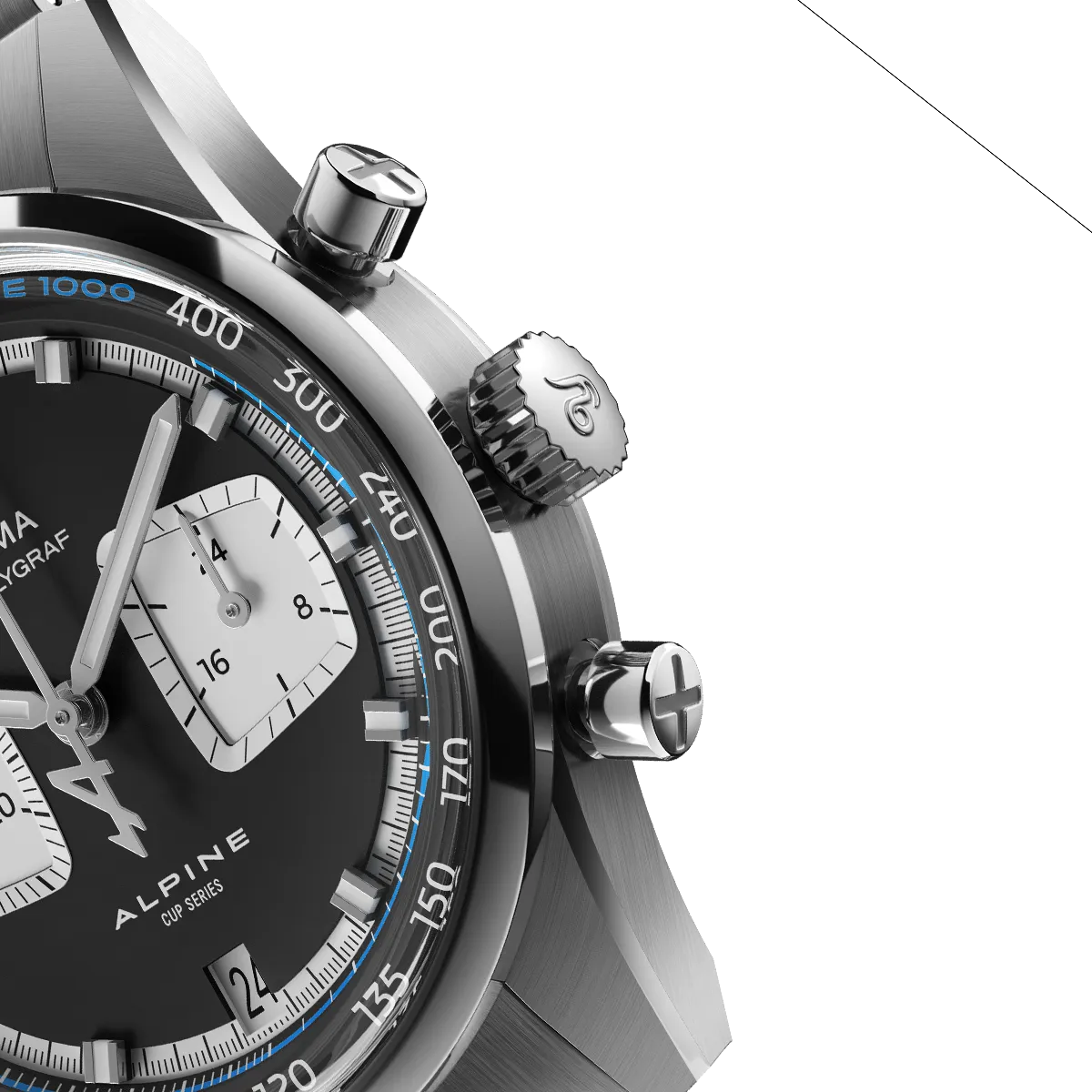Este diseño atemporal no sólo mejora la legibilidad, permitiendo leer cada contador de un vistazo, sino que también añade profundidad visual y elegancia deportiva. La fecha se equilibra en la posición de las 6 en punto junto con el logotipo de la Alpine Cup Series en la parte superior para acentuar el motivo de carreras. A destacar la punta azul Alpine de la aguja trotadora central, que apunta claramente al anillo con la escala taquimétrica.