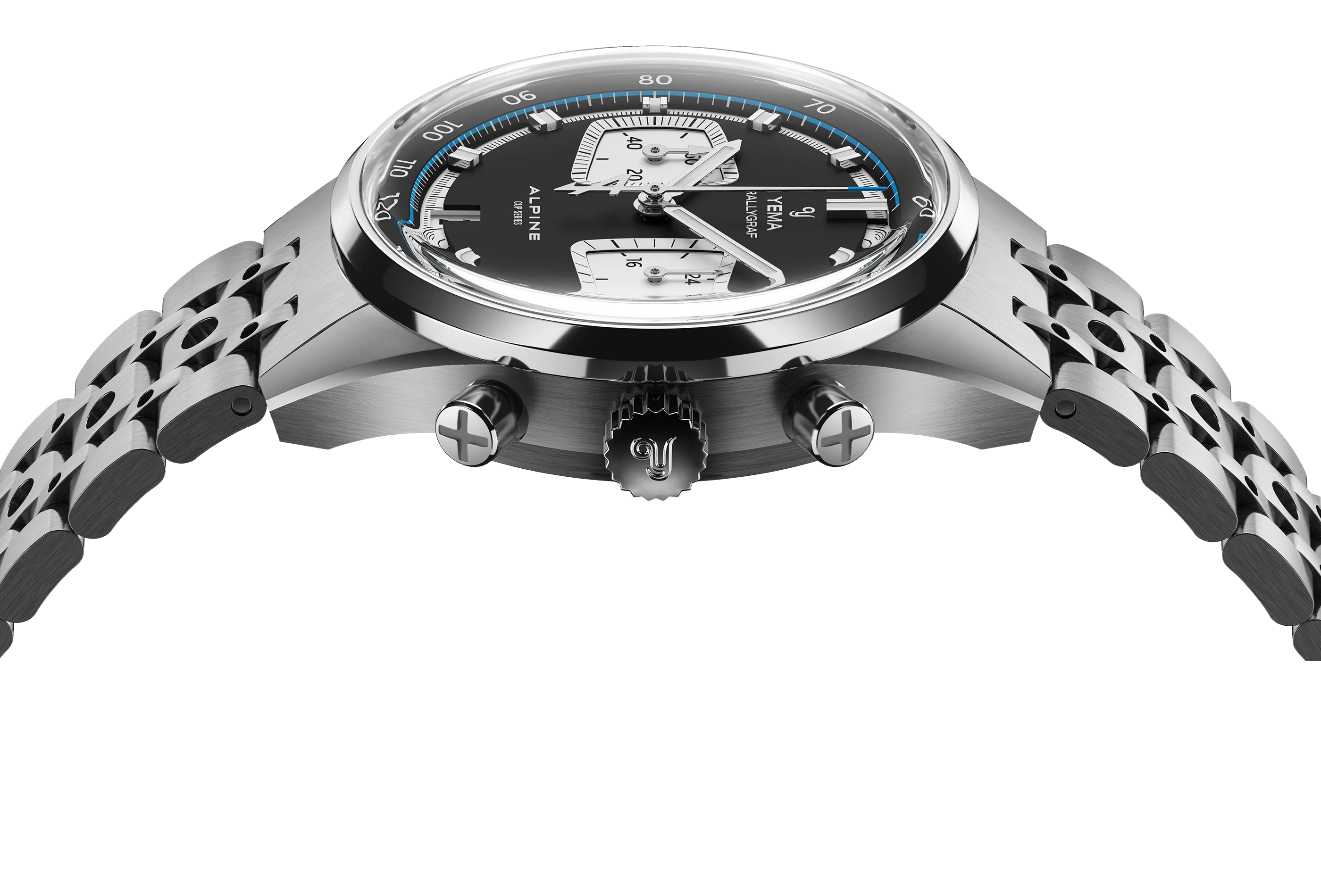 Especialmente concebido para la serie Rallygraf Alpine Elf Cup Series, el brazalete de acero Rally YEMA destaca por su diseño perforado distintivo, inspirado en los guantes vintage de automovilismo. Hecho de acero en acabado cepillado, combina el carácter deportivo y el encanto neo-vintage, complementando perfectamente el ADN de carreras del cronógrafo. El brazalete se estrecha suavemente hacia el cierre para una mayor comodidad y una presencia de muñeca más elegante, mientras que su cierre desplegable de acero integrado tiene un bloqueo de seguridad para un ajuste seguro y cómodo al usar.