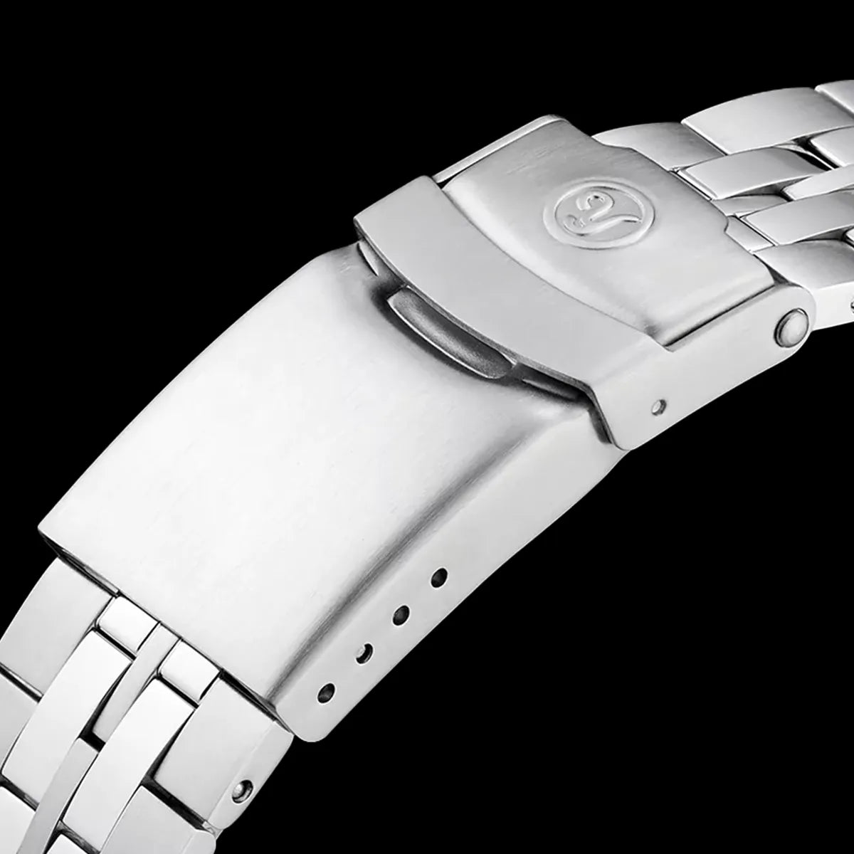 The 316 L Stainless Steel bracelet with secure lock comes with a divers extension so you can adjust it easily and quickly over a diving suit.