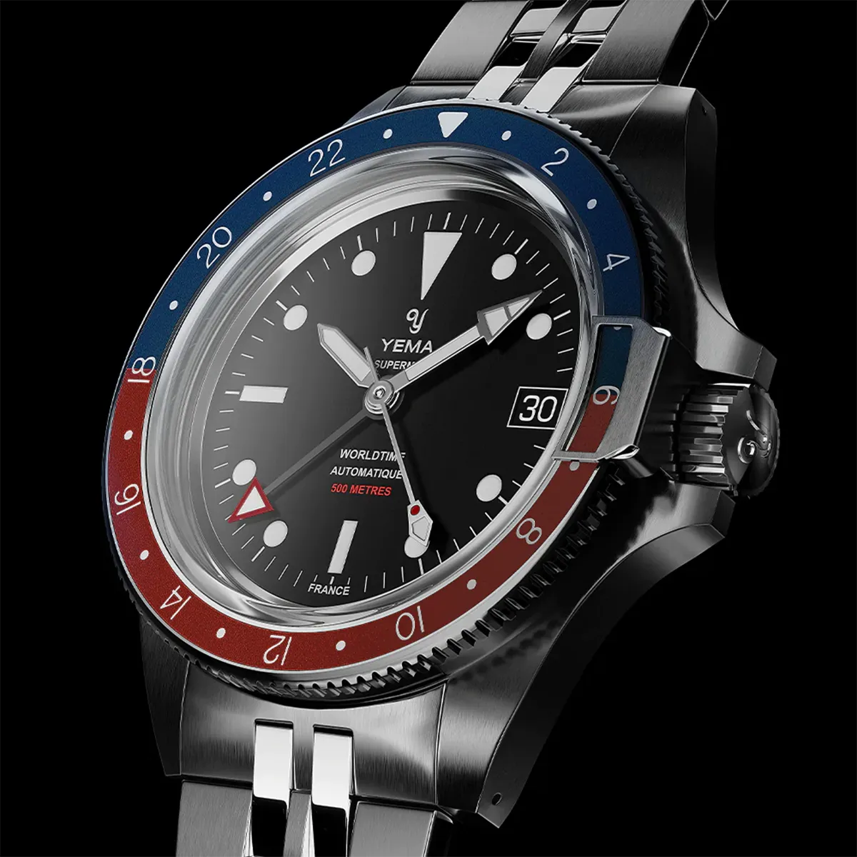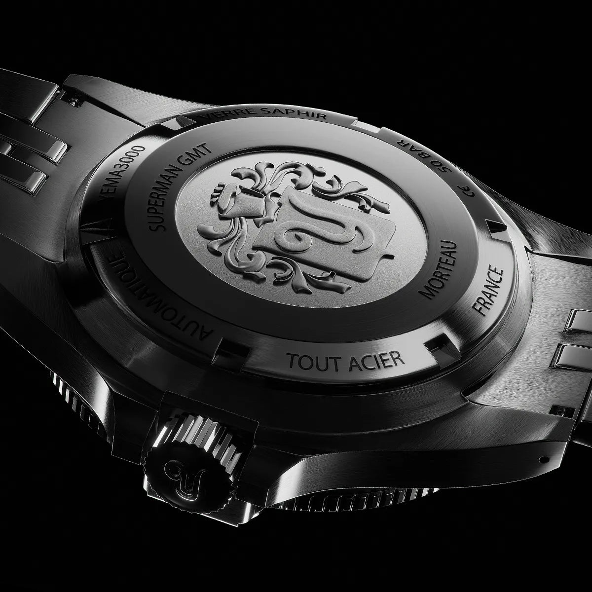 El nuevo Superman 500 GMT, una importante evolución del emblemático modelo de YEMA de los años 60, conserva sus principales características de buceo profesional al tiempo que ofrece una función GMT de 3 husos horarios para los trotamundos. Equipado con nuestro calibre interno YEMA3000 y por primera vez resistente al agua hasta 500 m, este Superman mejorado se beneficia de una arquitectura modernizada y de mejoras técnicas sustanciales que lo posicionan como el diver profesional francés definitivo.