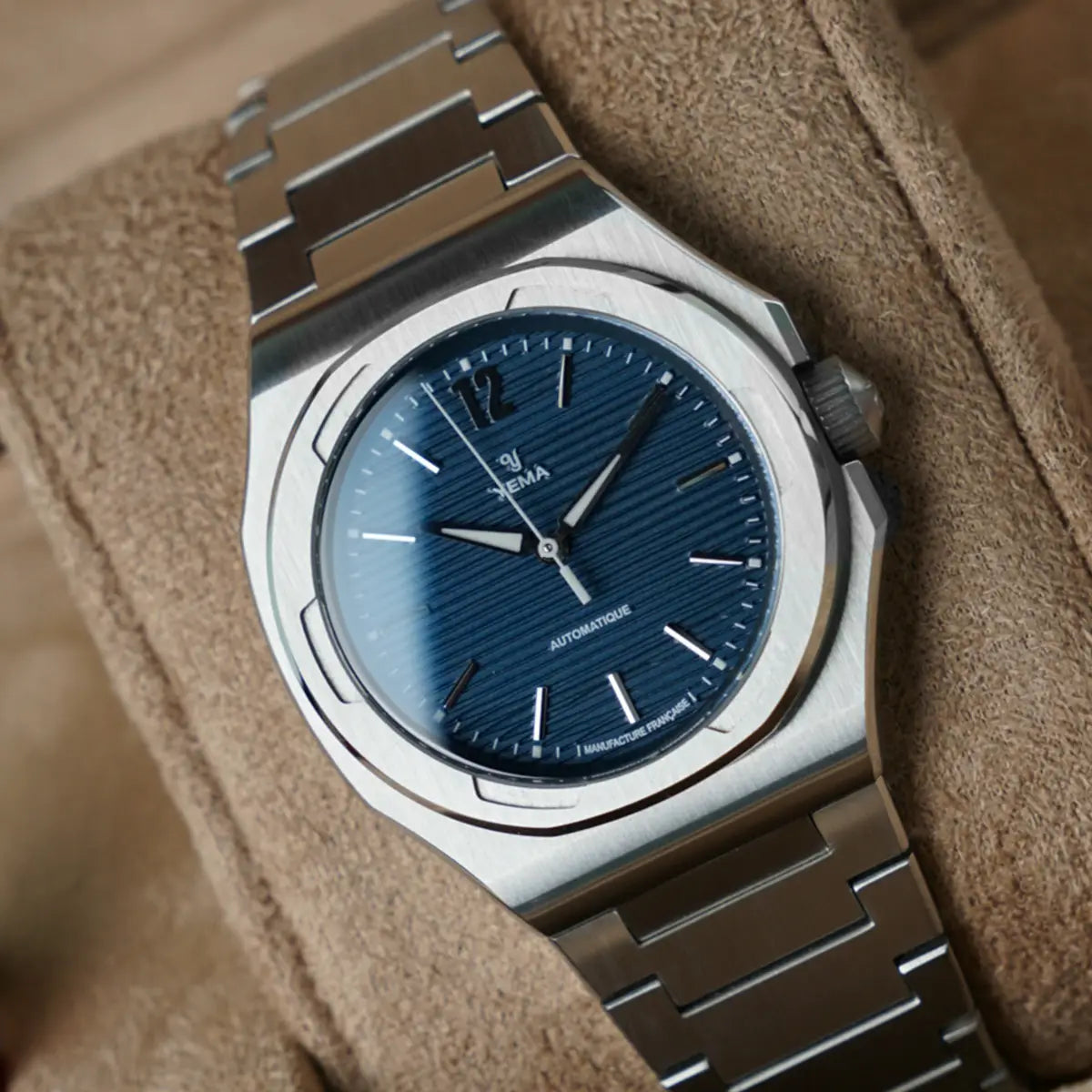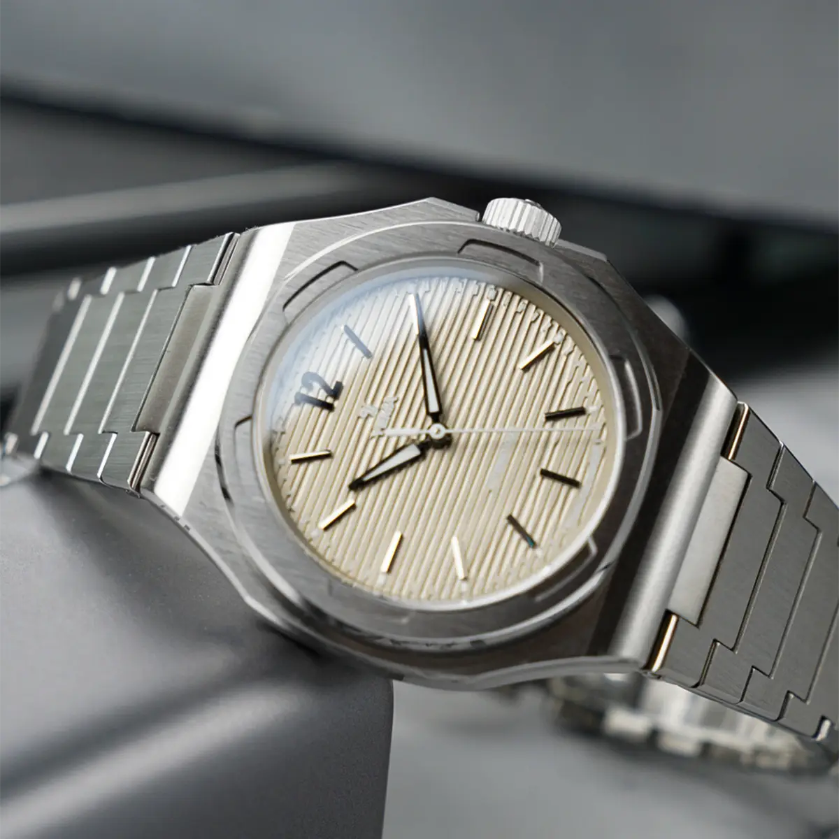 El patrón continuo de superficies verticales cepilladas y ángulos pulidos se extiende de forma natural desde la parte superior del bisel hasta la caja y el brazalete de acero integrado, creando la apariencia de una integración perfecta. Los eslabones decrecientes del brazalete continúan el efecto, las superficies verticales cepilladas siguen encontrándose con los ángulos pulidos hasta el cierre desplegable doble.