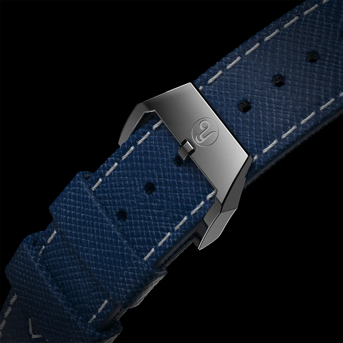 Confeccionada por una manufactura francesa de nuestra región, la correa de cuero granulado con pespuntes ha sido especialmente diseñada en los colores a juego del Yachtingraf.