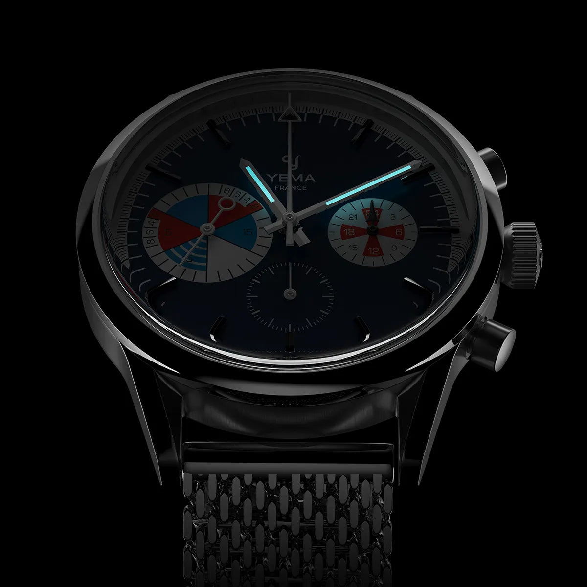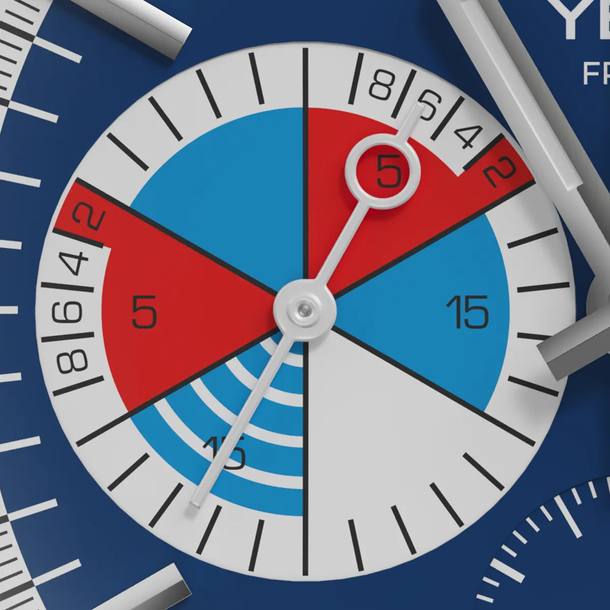 La esfera es la estrella del espectáculo, mezclando colores brillantes con la peculiar firma neo-vintage de YEMA. Esta esfera consta de una superficie principal mate con índices de acero en relieve y facetados con acabado pulido que combinan con elegancia con las agujas facetadas de acero pulido de las horas y los minutos. En el perímetro de la esfera hay una escala de segundos de color contrastado. La magia está en las subesferas de color: A las nueve se encuentra la cuenta atrás de la regata de minutos sobredimensionada, a las seis el segundero continuo y a las tres el contador de 24 horas en forma de cruz de Malta.