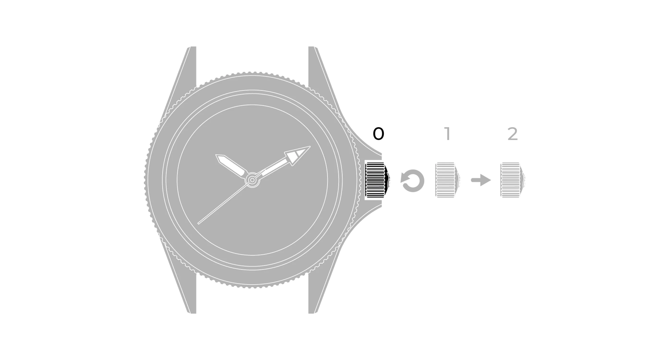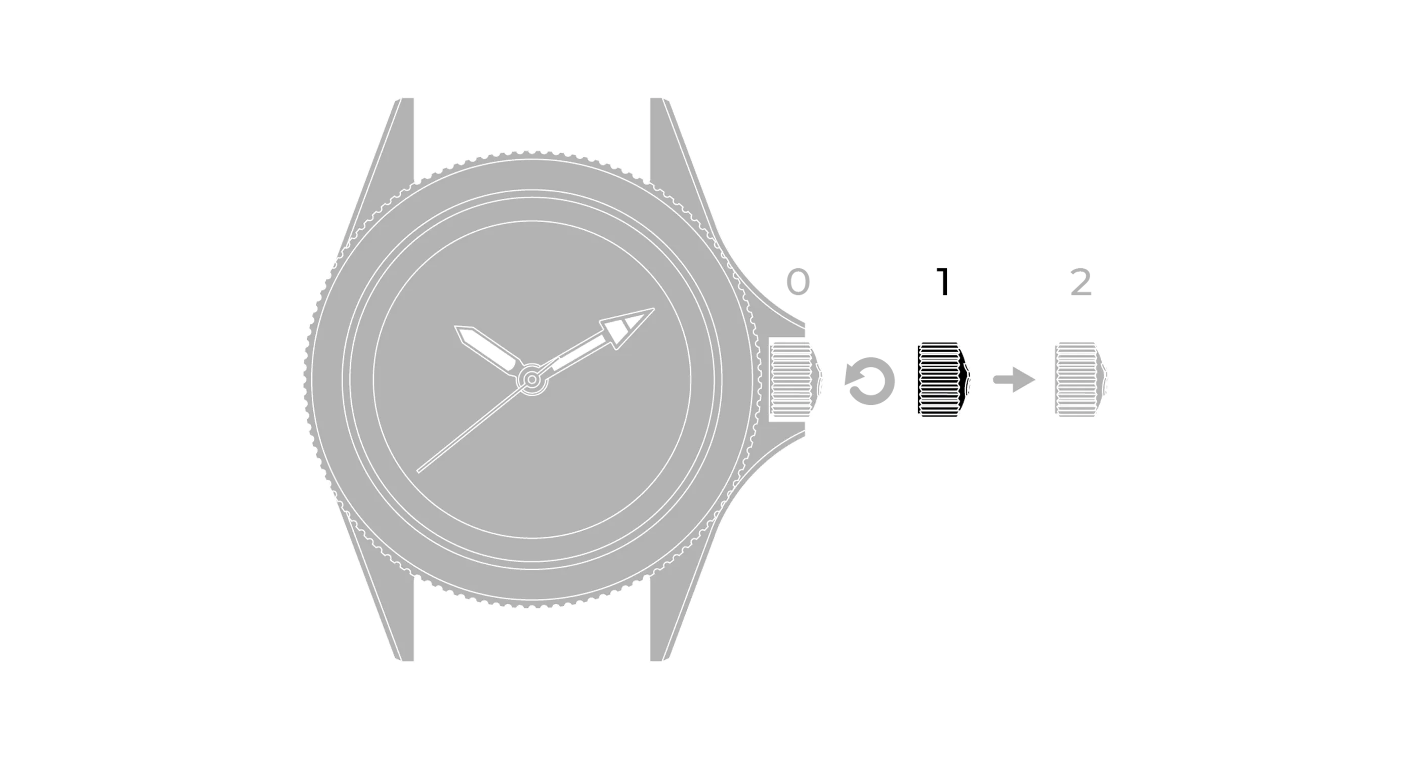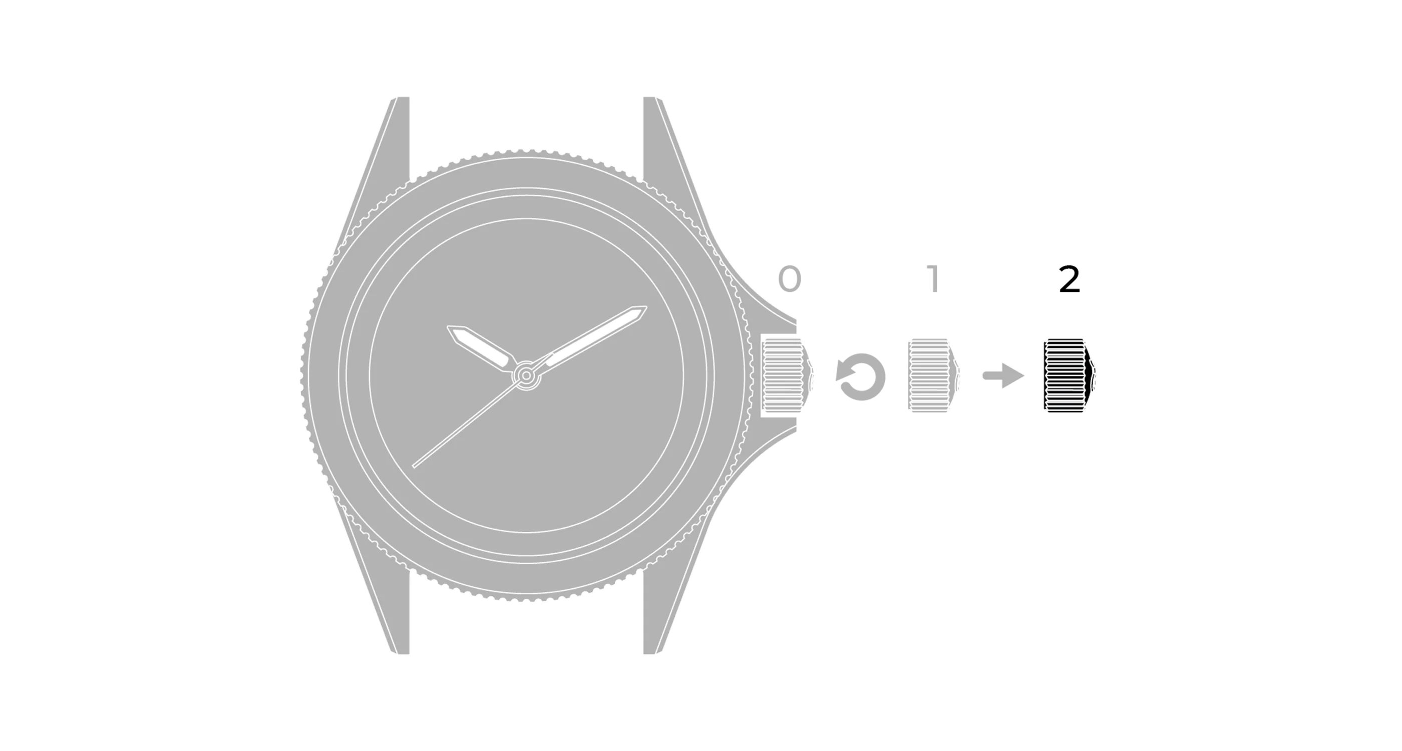 Tirer la couronne en position de de mise à l'heure (2) puis tournez la couronne dans n’importe quel sens pour régler vos aiguilles heures et minutes à laquelle vous souhaitez régler votre montre.