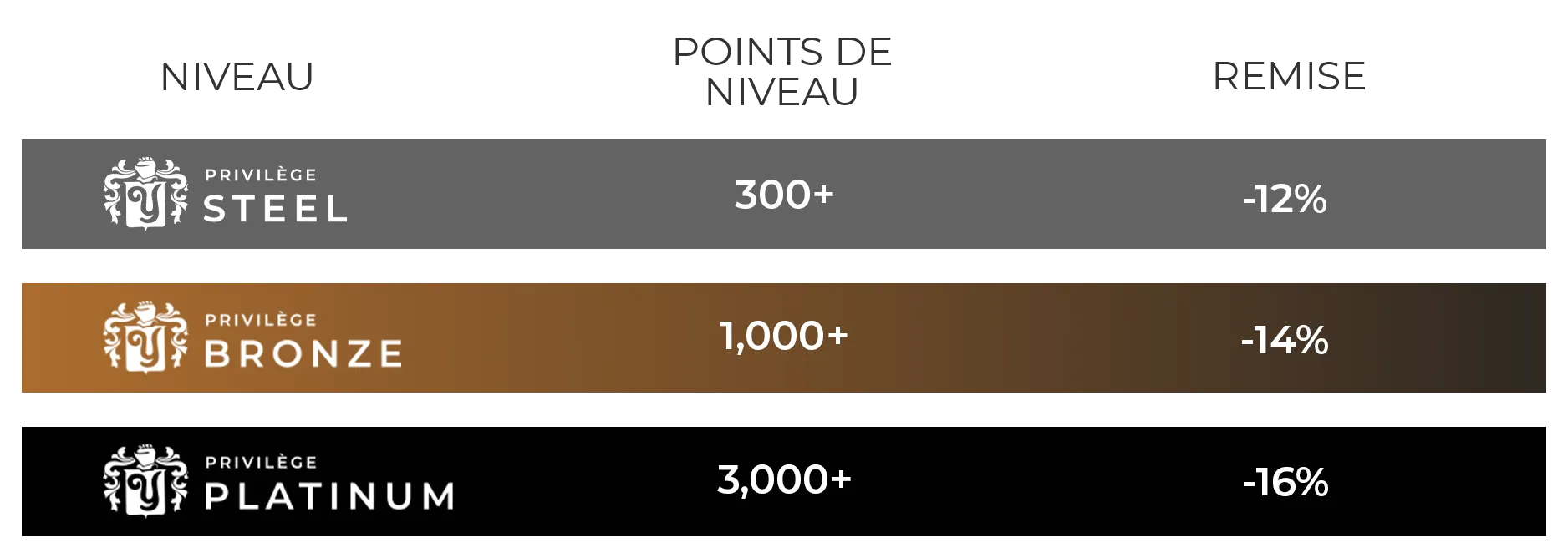 Vous accumulez des Points de Niveau à chaque achat, avis en ligne et recommandation d'un ami. Vous atteignez le niveau ACIER à partir de 300 Points de Niveau. Vous atteignez le niveau BRONZE à partir de 1 000 Points de Niveau. Vous atteignez le niveau PLATINUM à partir de 3 000 Points de Niveau.