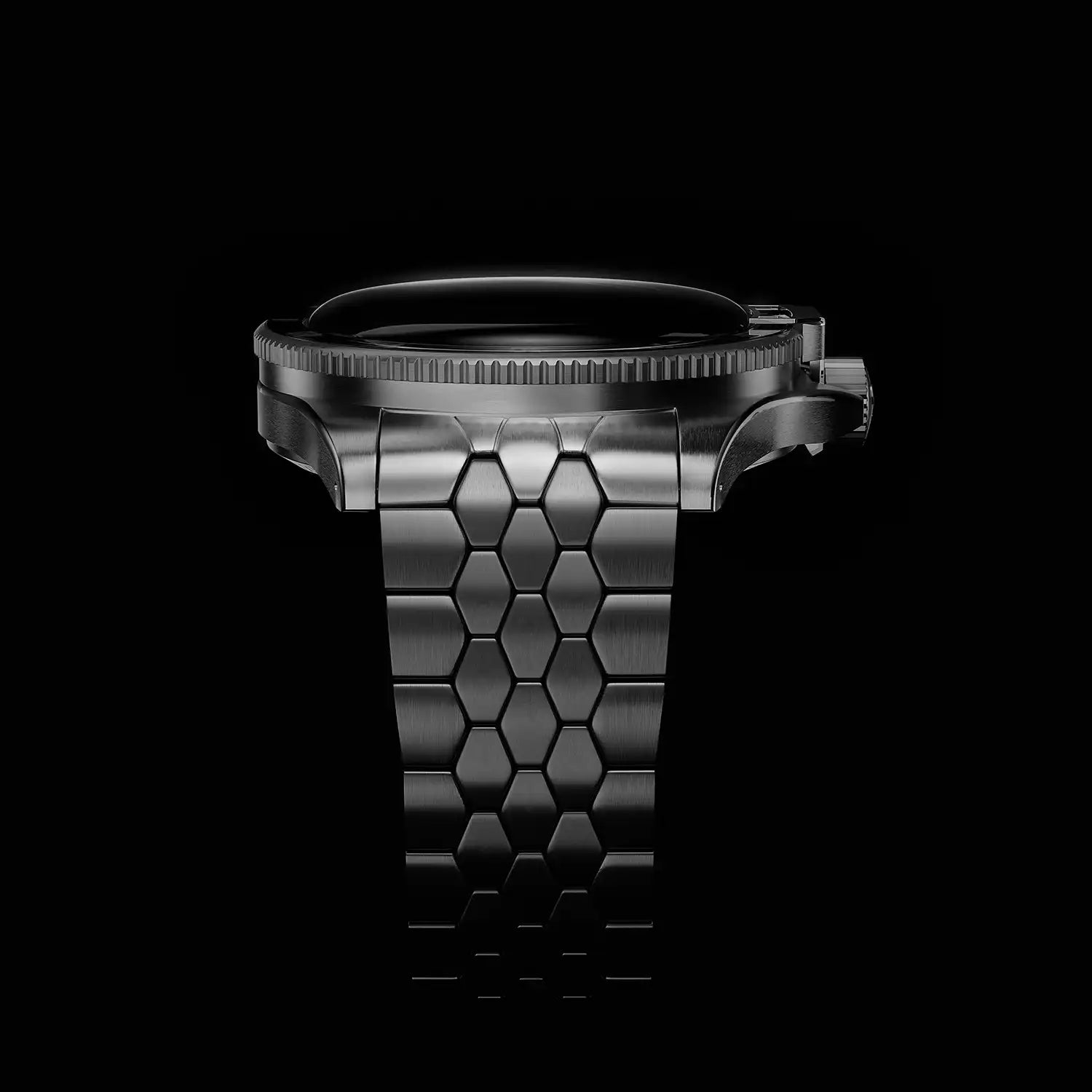The double-security folding clasp includes a dive extension for easy and quick adjustment of the bracelet over a diving suit.