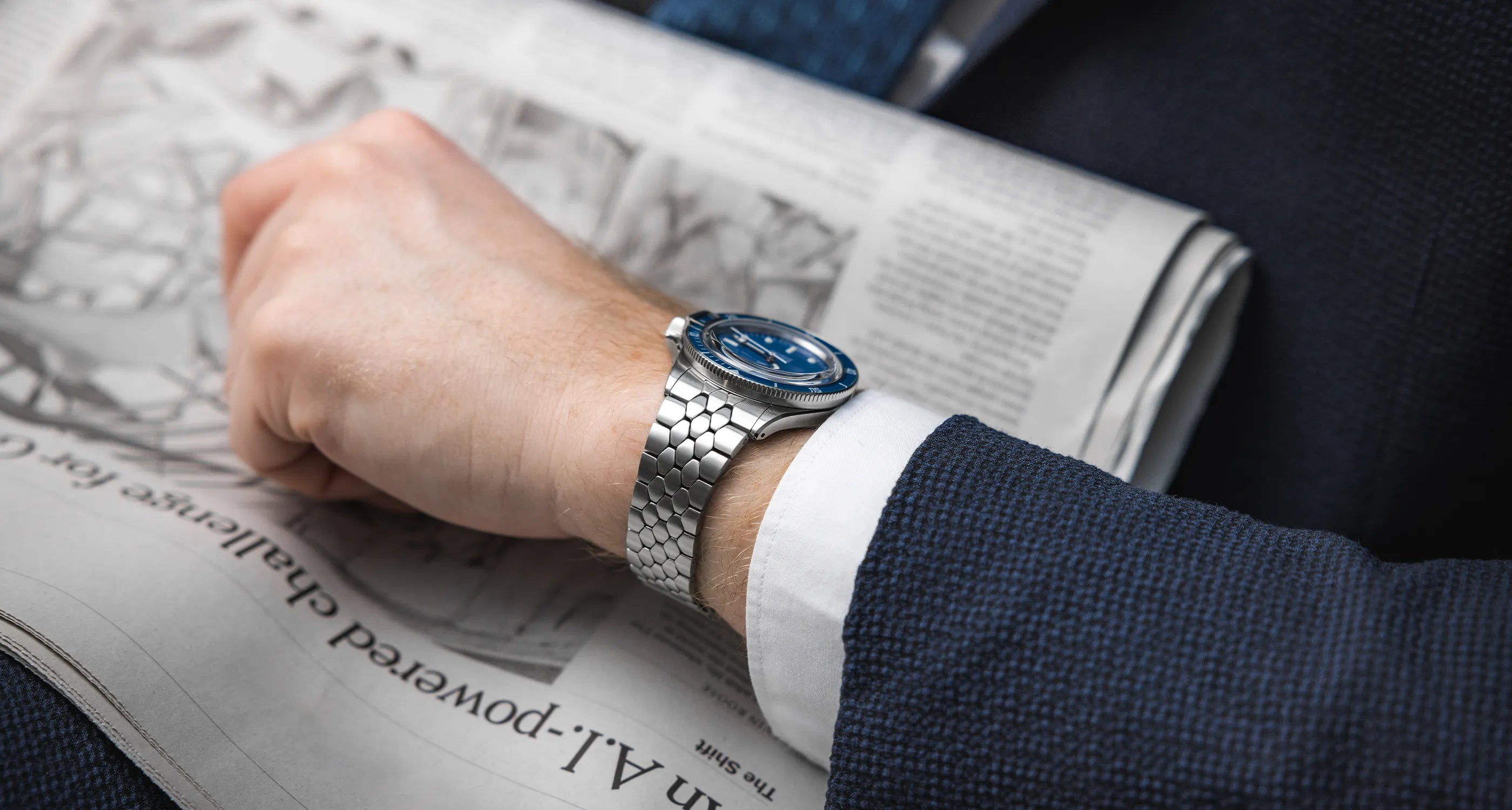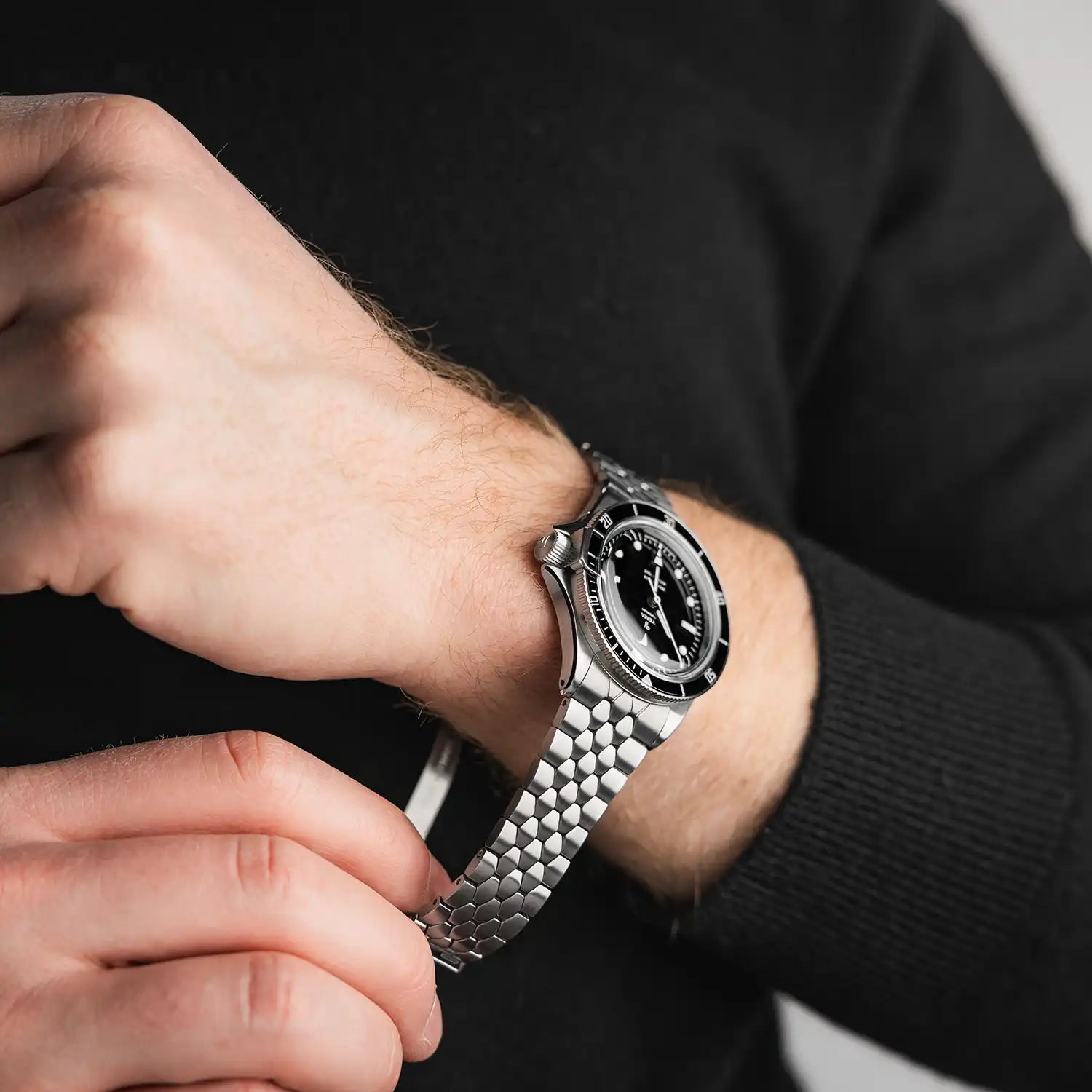 The iconic 1960s YEMA Scales bracelet has been slimmed down by 0.40mm so as to harmoniously integrate with the Superman Slim's thin case.