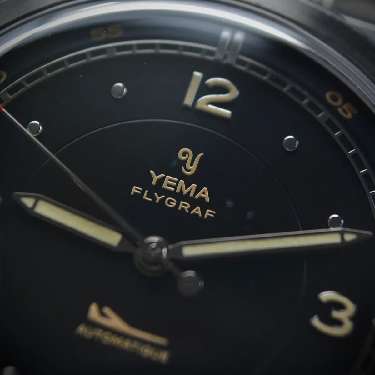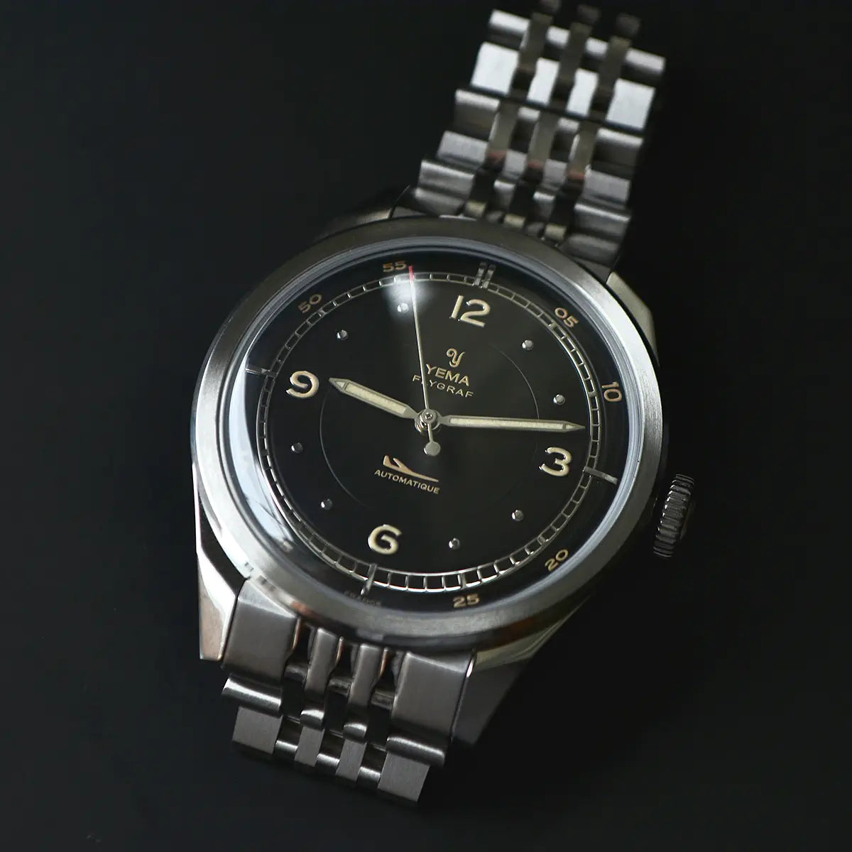 Le soin du détail se prolonge jusque sur le fond de boîtier en acier, où des finitions satinées et brossées circulaires mettent en valeur le blason historique de YEMA. Celui-ci est gravé avec précision à l’aide d’une presse hydraulique, offrant une signature à la fois qualitative et raffinée.