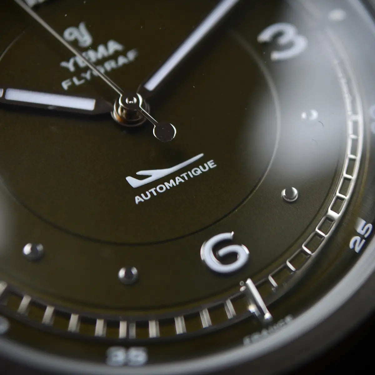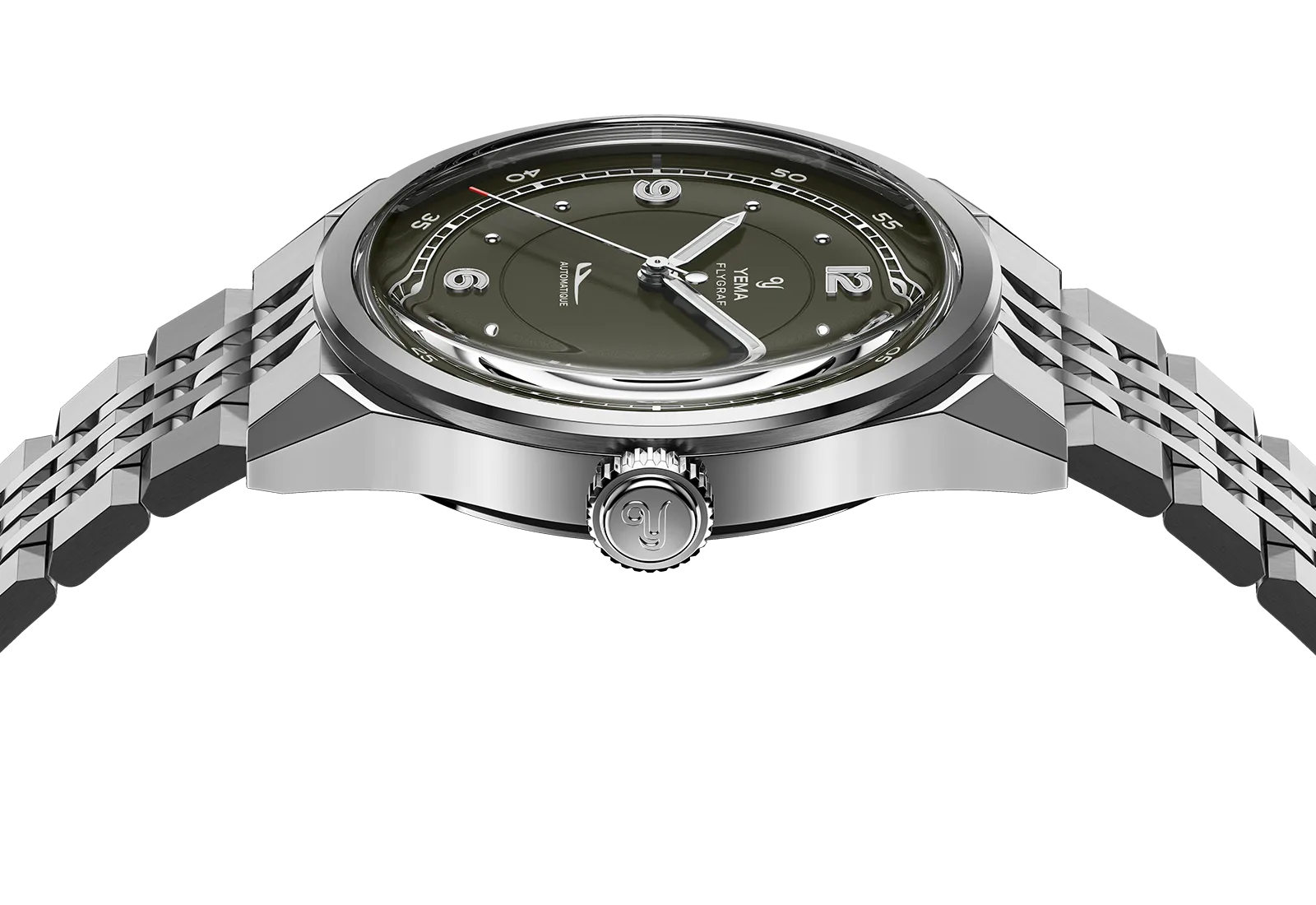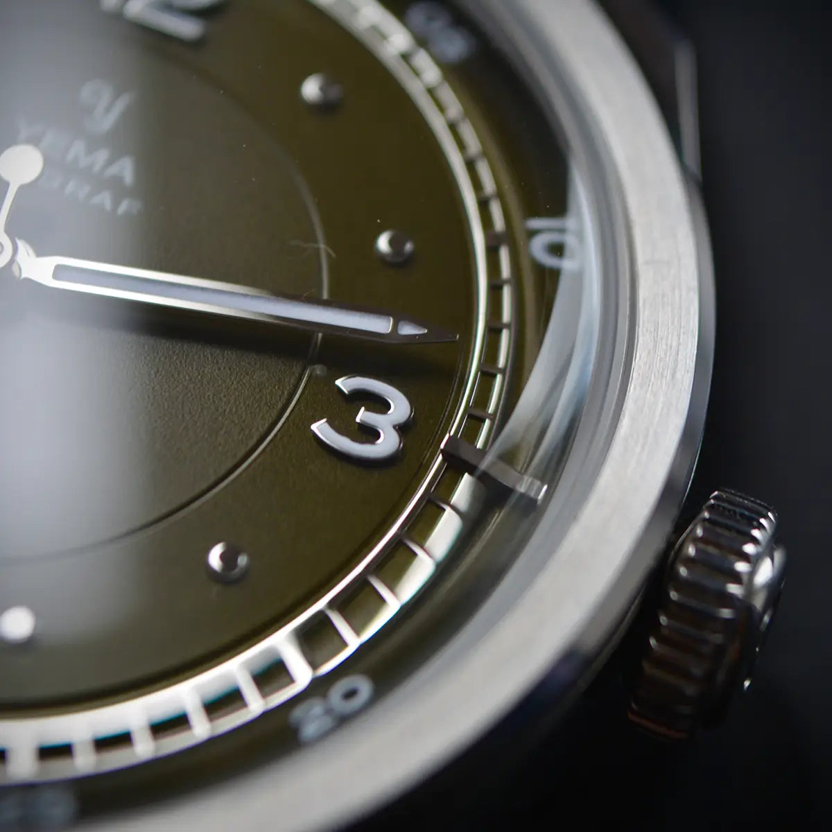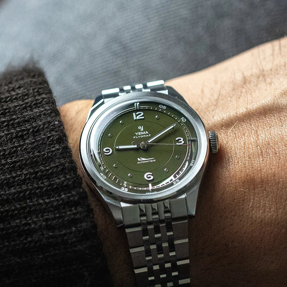 Le soin du détail se prolonge jusque sur le fond de boîtier en acier, où des finitions satinées et brossées circulaires mettent en valeur le blason historique de YEMA. Celui-ci est gravé avec précision à l’aide d’une presse hydraulique, offrant une signature à la fois qualitative et raffinée.