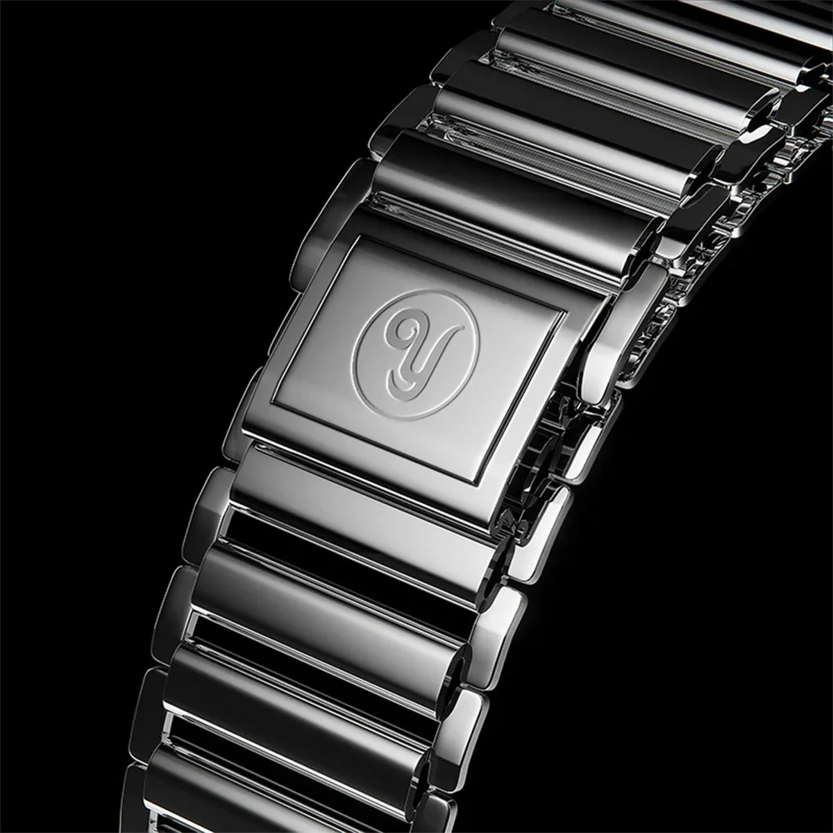 Le bracelet en acier inoxydable est disponible en 197 mm et 232 mm de long et peut être facilement ajusté du fait de sa conception qui lui permet de venir insérer son attache dans n'importe quel maillon du bracelet. Le système d'attache rapide permet d'enfiler et d'enlever le bracelet instantanément.