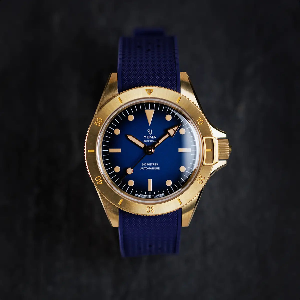 Décliné en bleu dégradé et noir laqué, le cadran emblémathique très épuré de la Superman Bronze est désormais francisé, arborant fièrement la mention MANUFACTURE FRANÇAISE à 6h pour réfleter le nouveau positionnement de YEMA suite à l'internalisation de la fabrication de composants du calibre CMM.10 et la production locale des habillages.