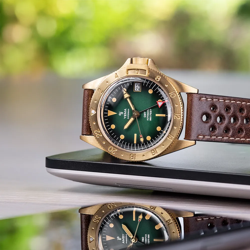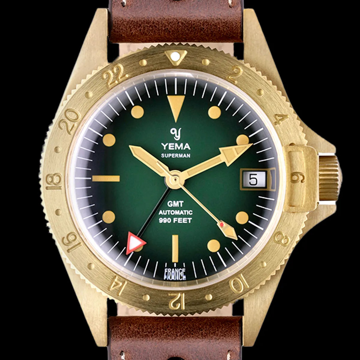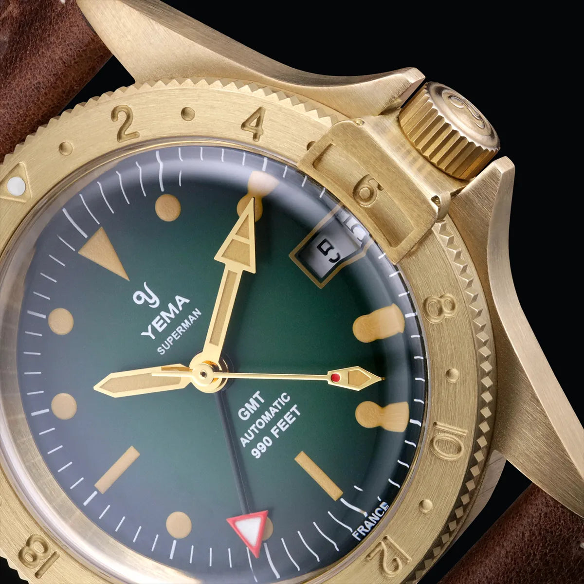 Équipée de notre Calibre Maison GMT YEMA3000 de deuxième génération, ce garde-temps conserve l'ensemble des aspects design de sa prédécesseur tout en proposant un cadran vert dégradé mat qui contraste parfaitement avec la lunette en bronze GMT et ses index gravés.