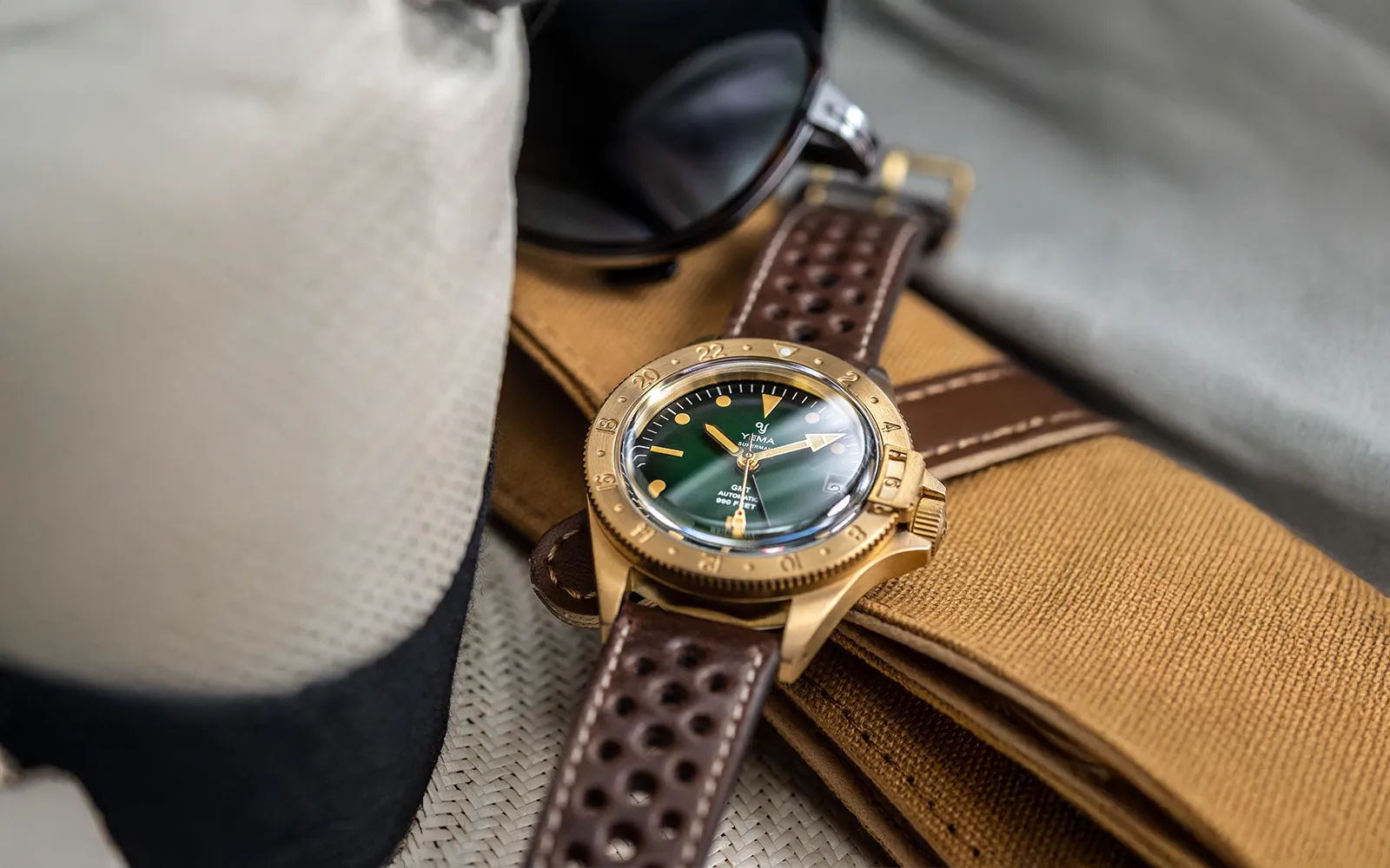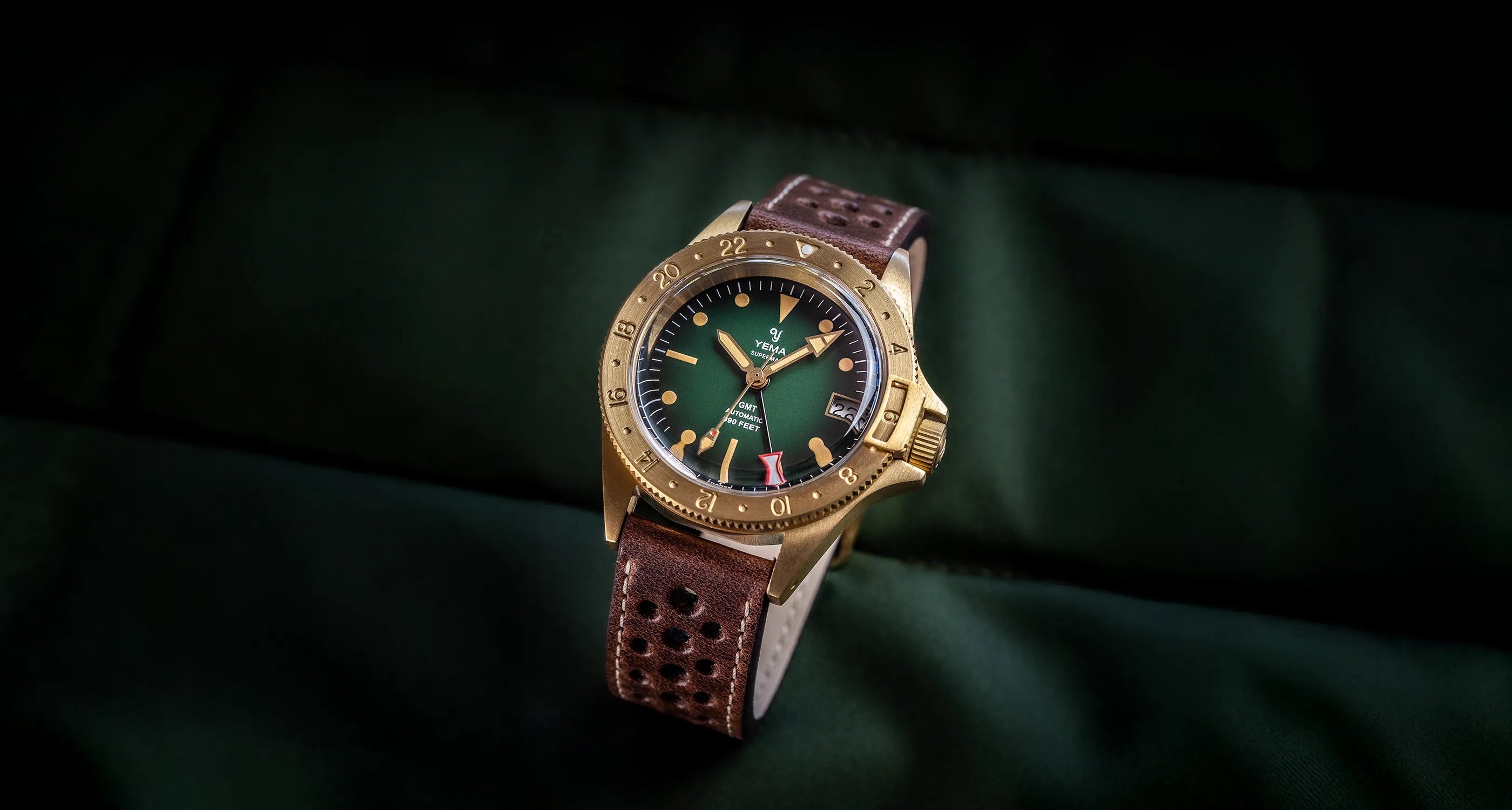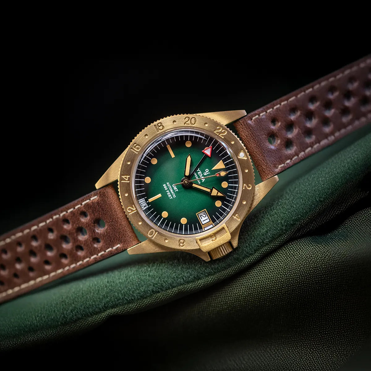 Équipée de notre Calibre Maison GMT YEMA3000 de deuxième génération, ce garde-temps conserve l'ensemble des aspects design de sa prédécesseur tout en proposant un cadran vert dégradé mat qui contraste parfaitement avec la lunette en bronze GMT et ses index gravés.
