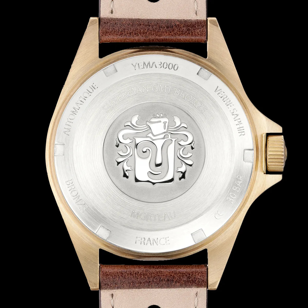 La Superman Heritage GMT Bronze est une montre professionnelle équipée d'une aiguille GMT et d'une lunette tournante 24h vous permettant de lire 3 fuseaux horaires différents.