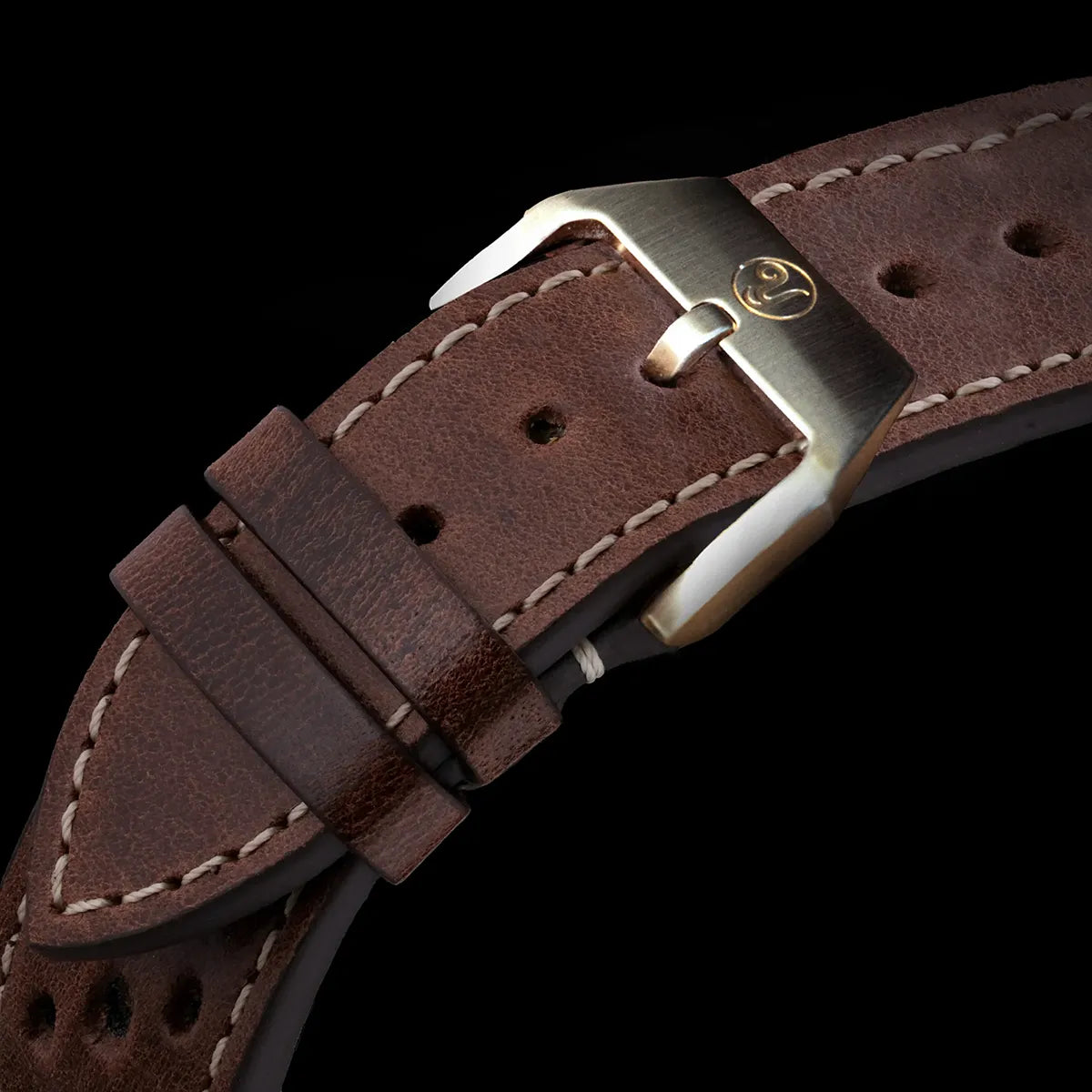 Pour un usage quotidien, nous avons conçu un bracelet en cuir marron vintage qui accentue l'aspect général vintage de la Superman Heritage GMT Bronze et s'adapte parfaitement à la patine naturelle du boîtier en bronze.