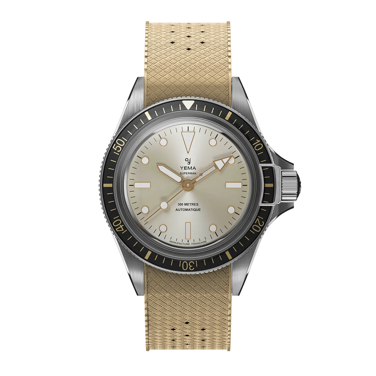 Questo cinturino integrato in gomma è stato specificamente progettato per adattarsi elegantemente alle lunghe alette dritte di tutti i modelli di Superman e preservare la sua iconica estetica retrò. Realizzata in gomma FKM VITON® di alta qualità, questo cinturino è ideale per le immersioni grazie alla sua elevata resistenza all'acqua salata, al sole e alle temperature estreme, fornendo al contempo una vestibilità e una sensazione confortevoli al polso.