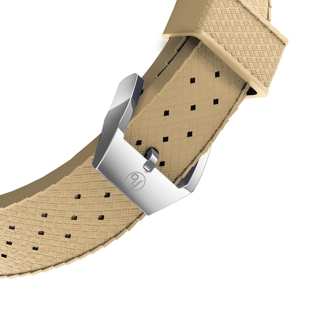Questo cinturino conserva la trama iconica, la silhouette e la sorprendente estetica retrò del cinturino in gomma degli anni '60. Il suo design iconico presenta un motivo rialzato simile a una cialda sul lato inferiore, fornendo una traspirabilità superiore e impedendo al cinturino di attaccarsi alla pelle.