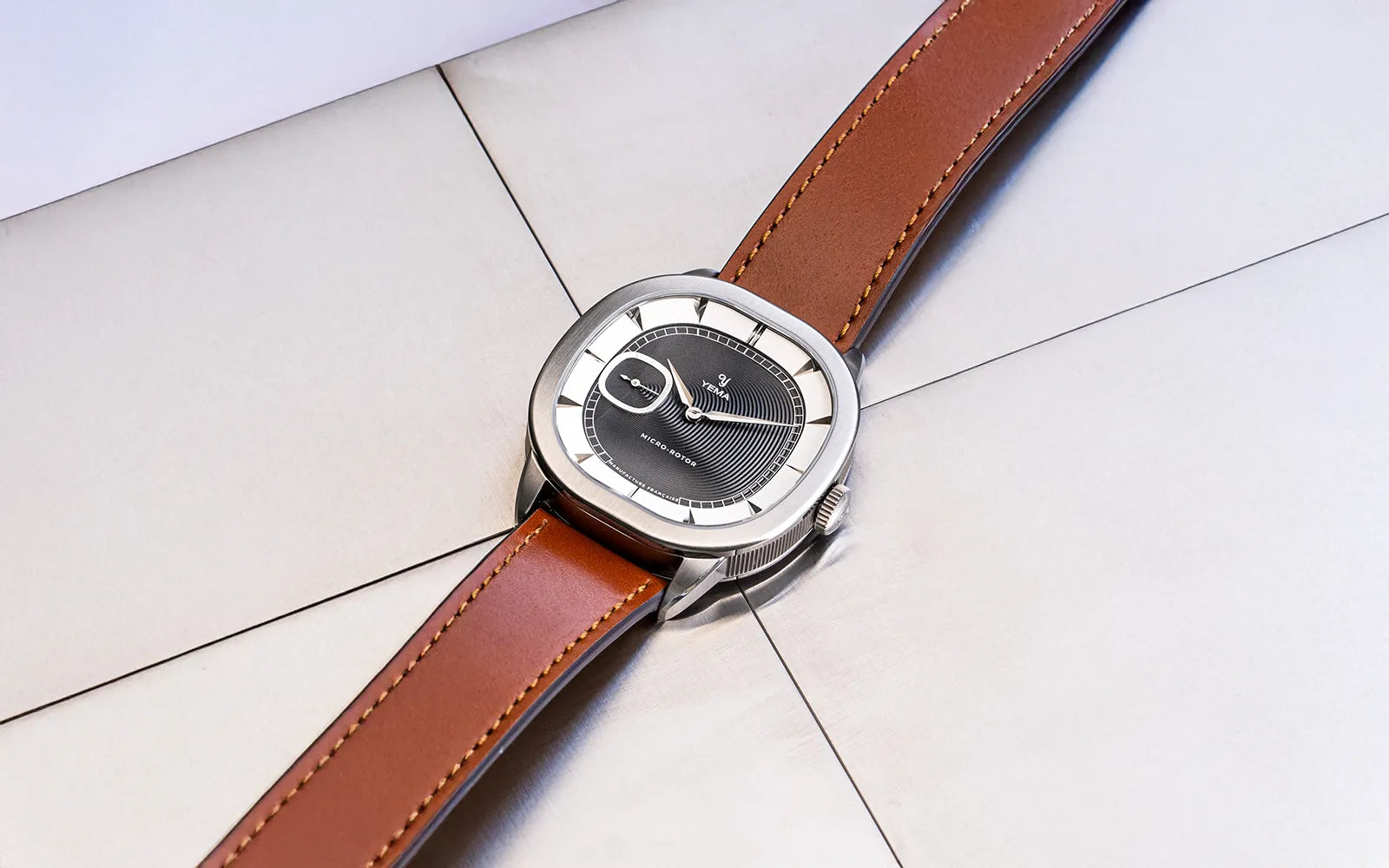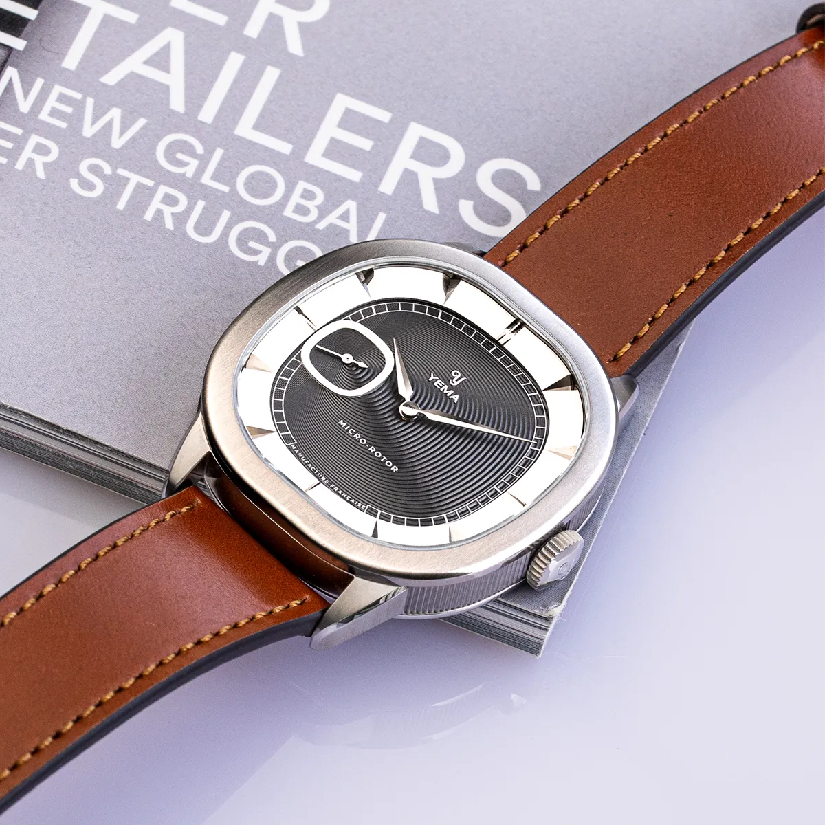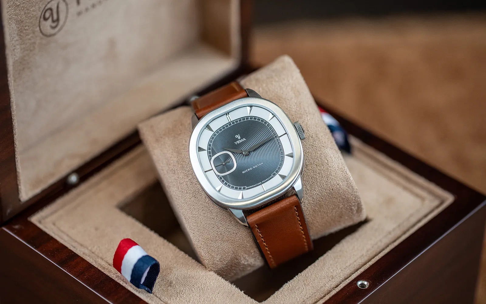 La cassa da 39 mm a forma di cuscino si ispira agli archi del Palazzo Granvelle a Besançon, capitale della regione francese dell’orologeria dove si trovano le officine di YEMA.