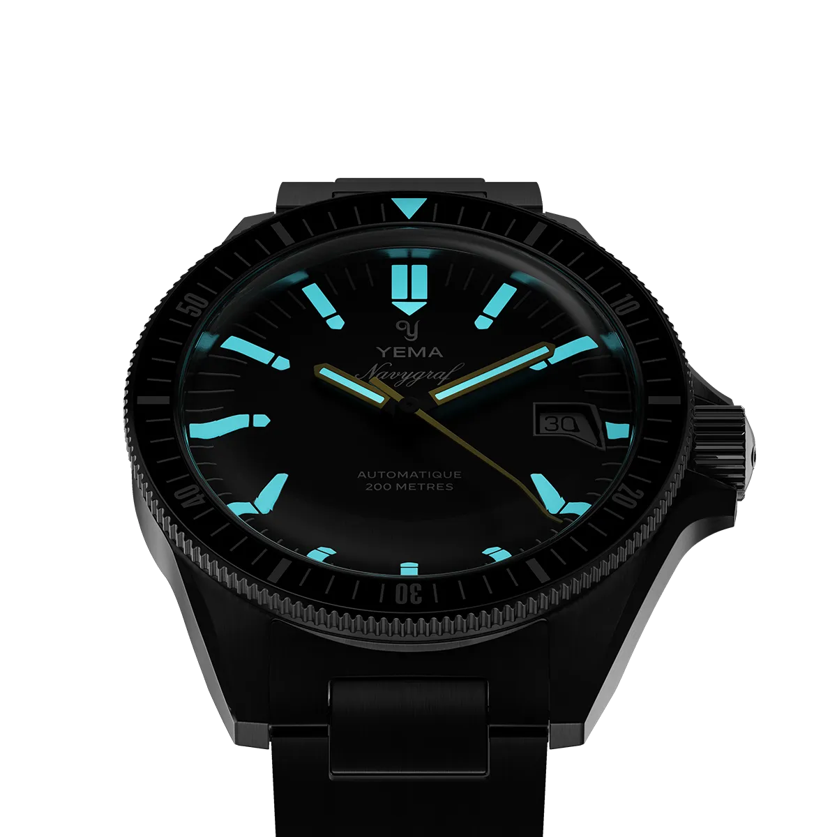 Al centro spiccano le lancette gialle, tratto distintivo dell’identità del Navygraf, progettate per garantire assoluta chiarezza e leggibilità immediata in qualsiasi condizione. Intorno a loro, il quadrante è punteggiato dagli inconfondibili indici a punto esclamativo, un dettaglio di design giocoso ma iconico che ha reso questo orologio immediatamente riconoscibile per generazioni, reintroducendo al contempo un altro richiamo al passato: la complicazione della data.