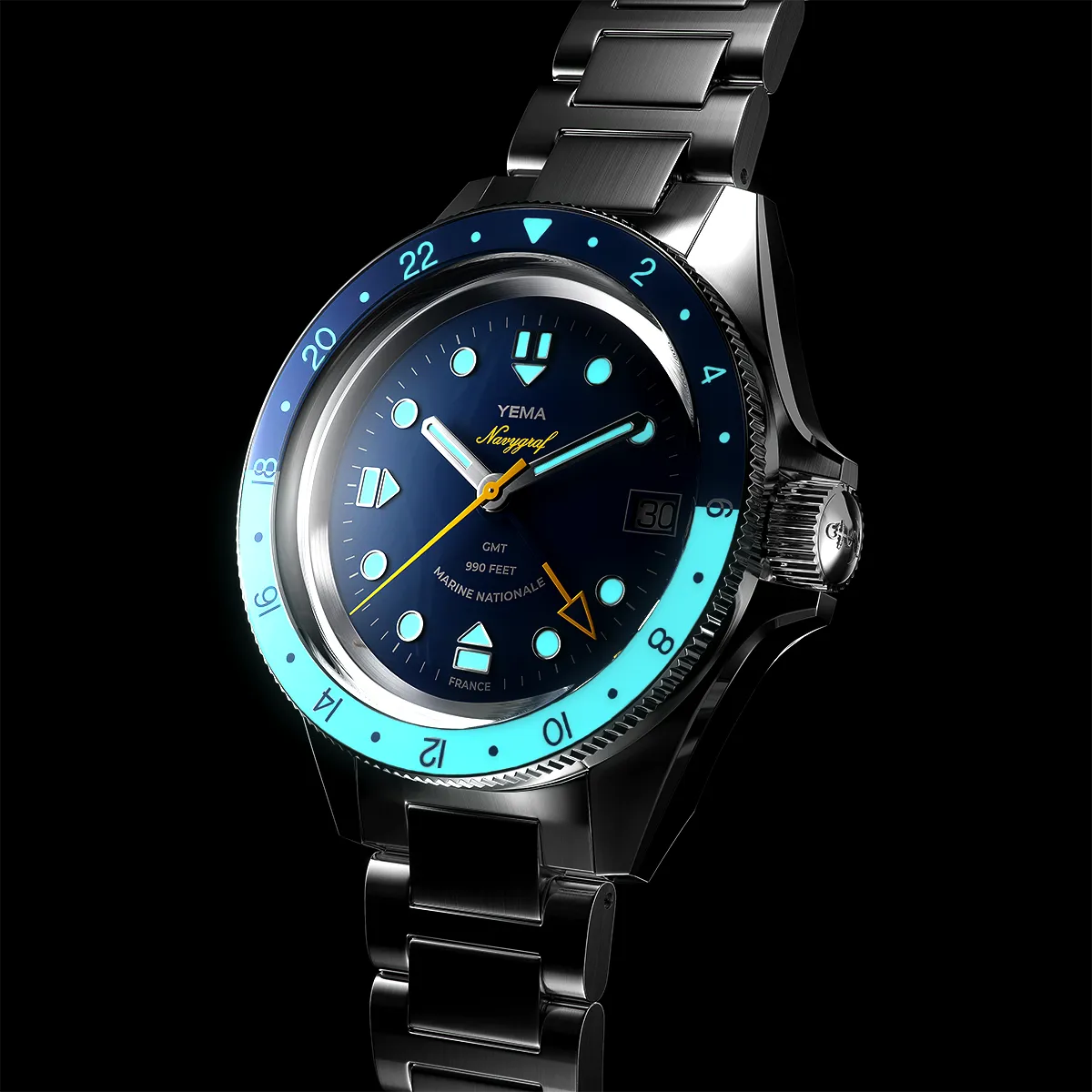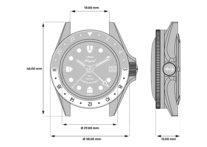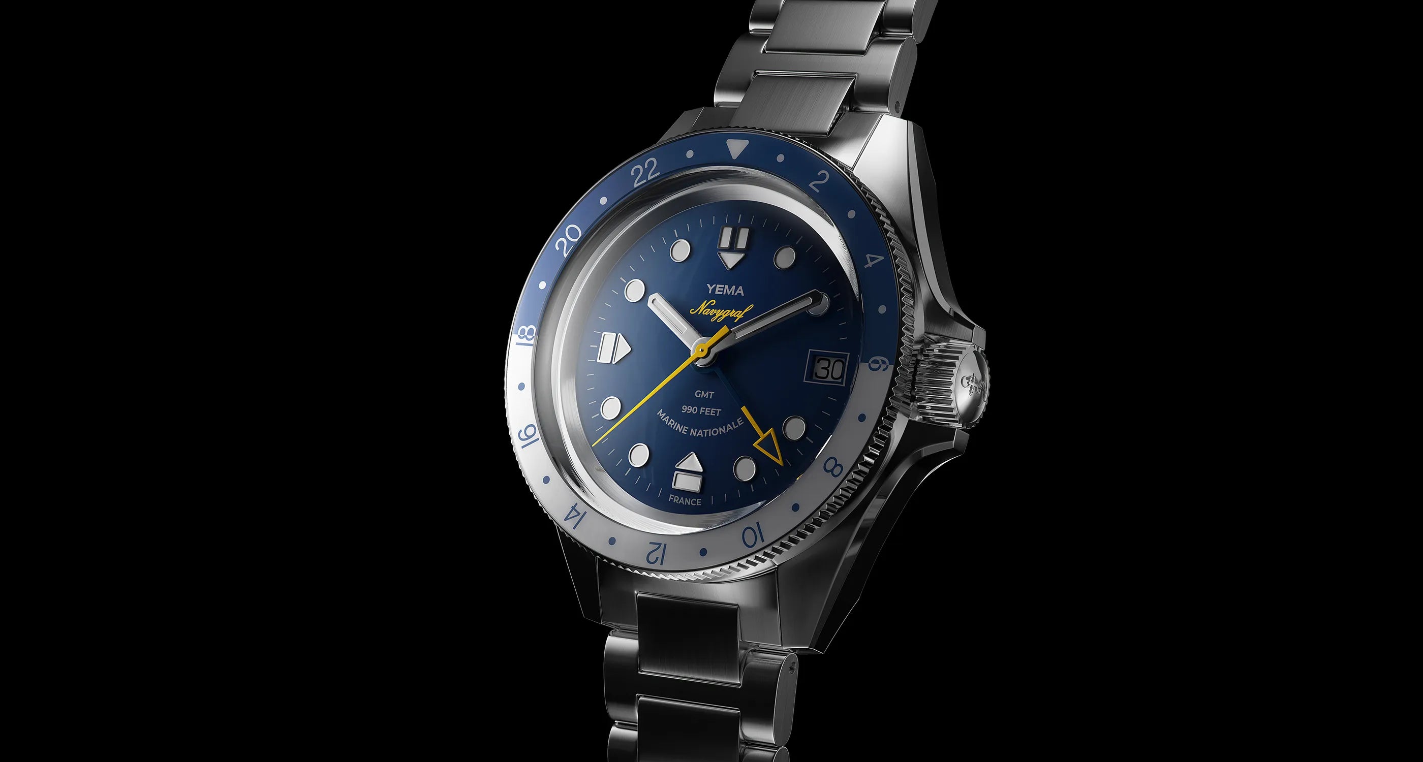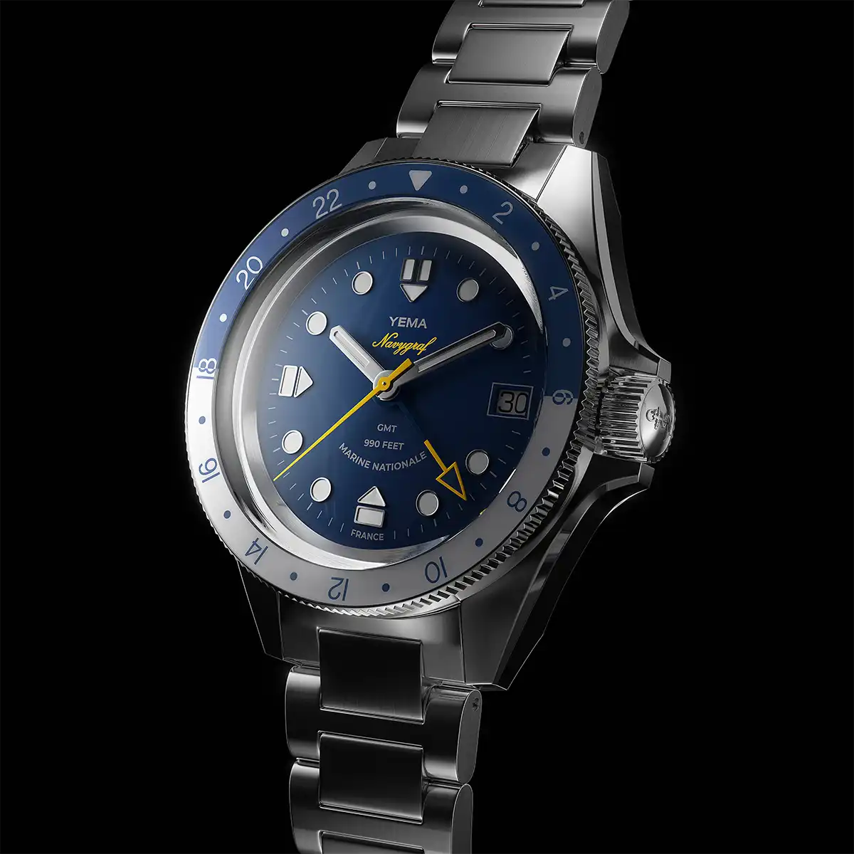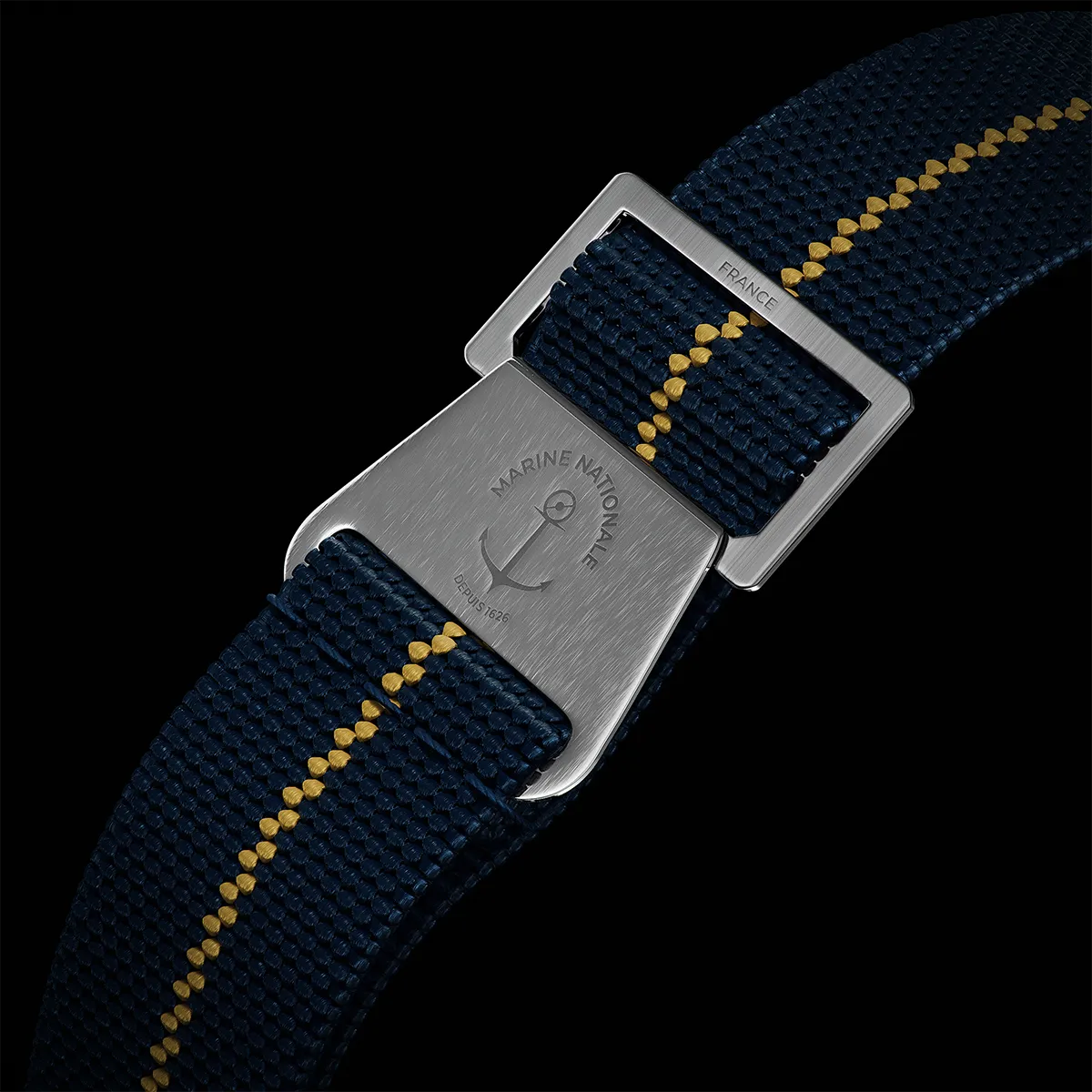 Il quadrante si ispira al Navygraf II degli anni '70 e presenta indici delle ore in rilievo in acciaio lucido abbinati alle lancette e che conferiscono ulteriore profondità al quadrante. Gli indici e le lancette bianchi, in contrasto con il quadrante blu Navy, assicurano un'elevata leggibilità in ogni circostanza. La lancetta ampia, la lancetta GMT e il logo Navygraf sono elegantemente evidenziati in giallo. Orologio ufficiale della marina francese con menzione Marine Nationale a ore 6.