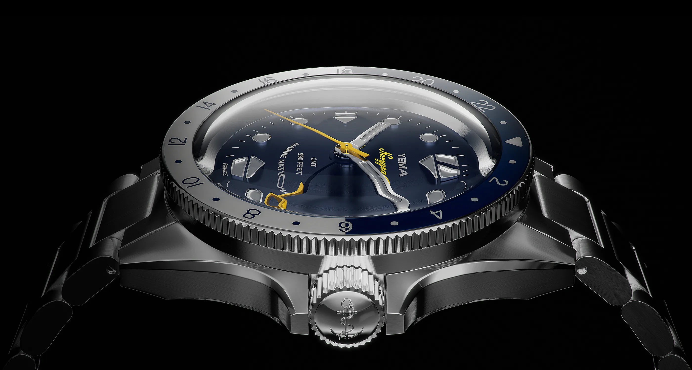 Il calibro interno GMT di seconda generazione YEMA3000 è alimentato da componenti ottimizzati che offrono prestazioni migliori rispetto ai calibri di grado standard simili, offrendo uno scarto giornaliero di +/- 10 s/g e una riserva di carica di 42 ore.