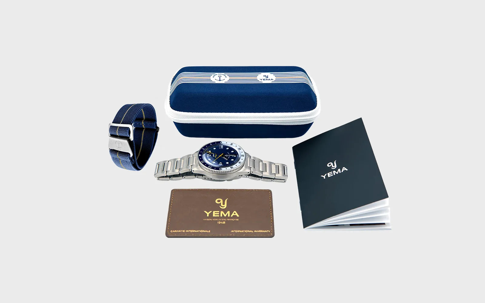 Orologio fornito con 2 cinturini (acciaio inossidabile o gomma FKM VITON® + cinturino elastico ufficiale della Marina Francese), una custodia da viaggio della Marina Nazionale e una tessera di garanzia internazionale di 2 anni in pelle.