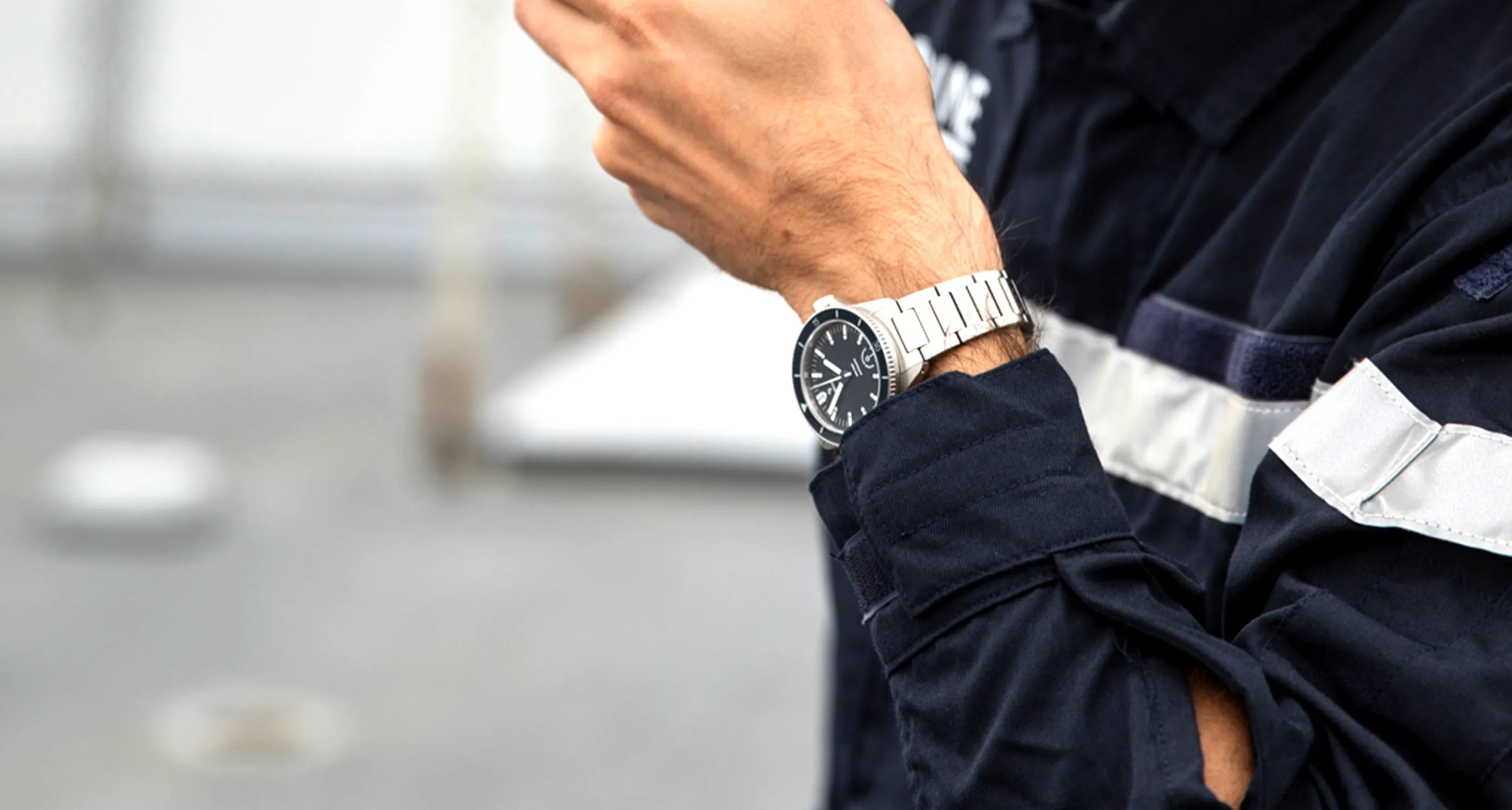 Gli iconici indici sono sagomati nella forma di un punto esclamativo, firma distintiva del modello Navygraf vintage degli anni '70. Il quadrante blu opaco e la menzione dorata Navygraf, esibiscono con orgoglio i colori ufficiali della Marine Nationale insieme al loro logo a ore 6.