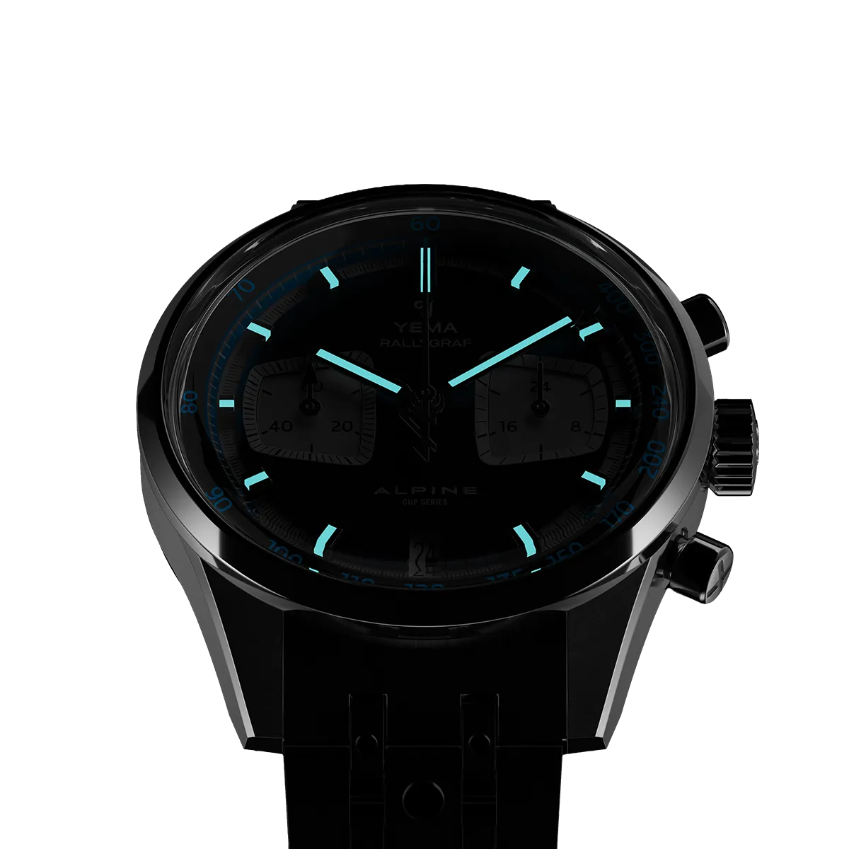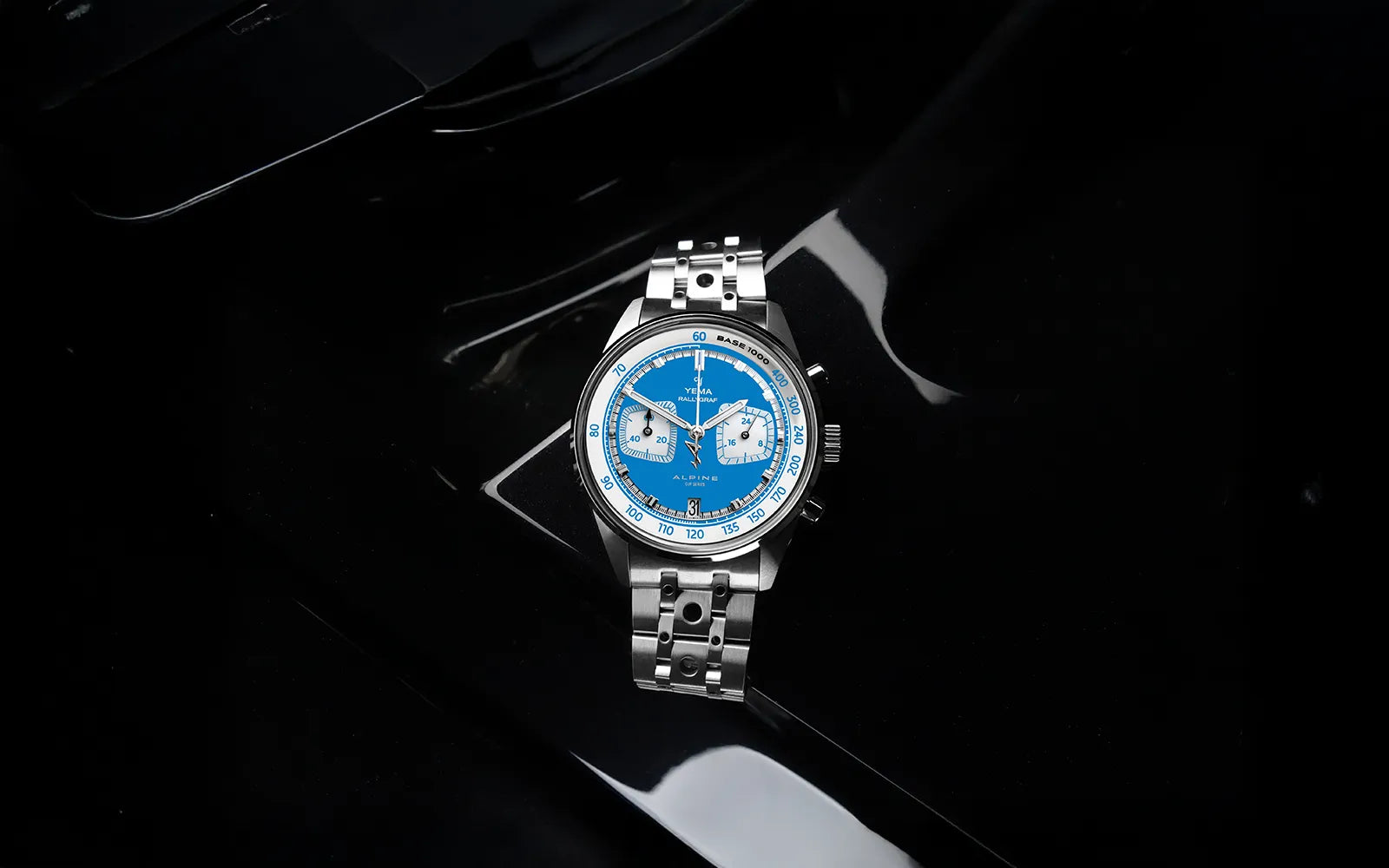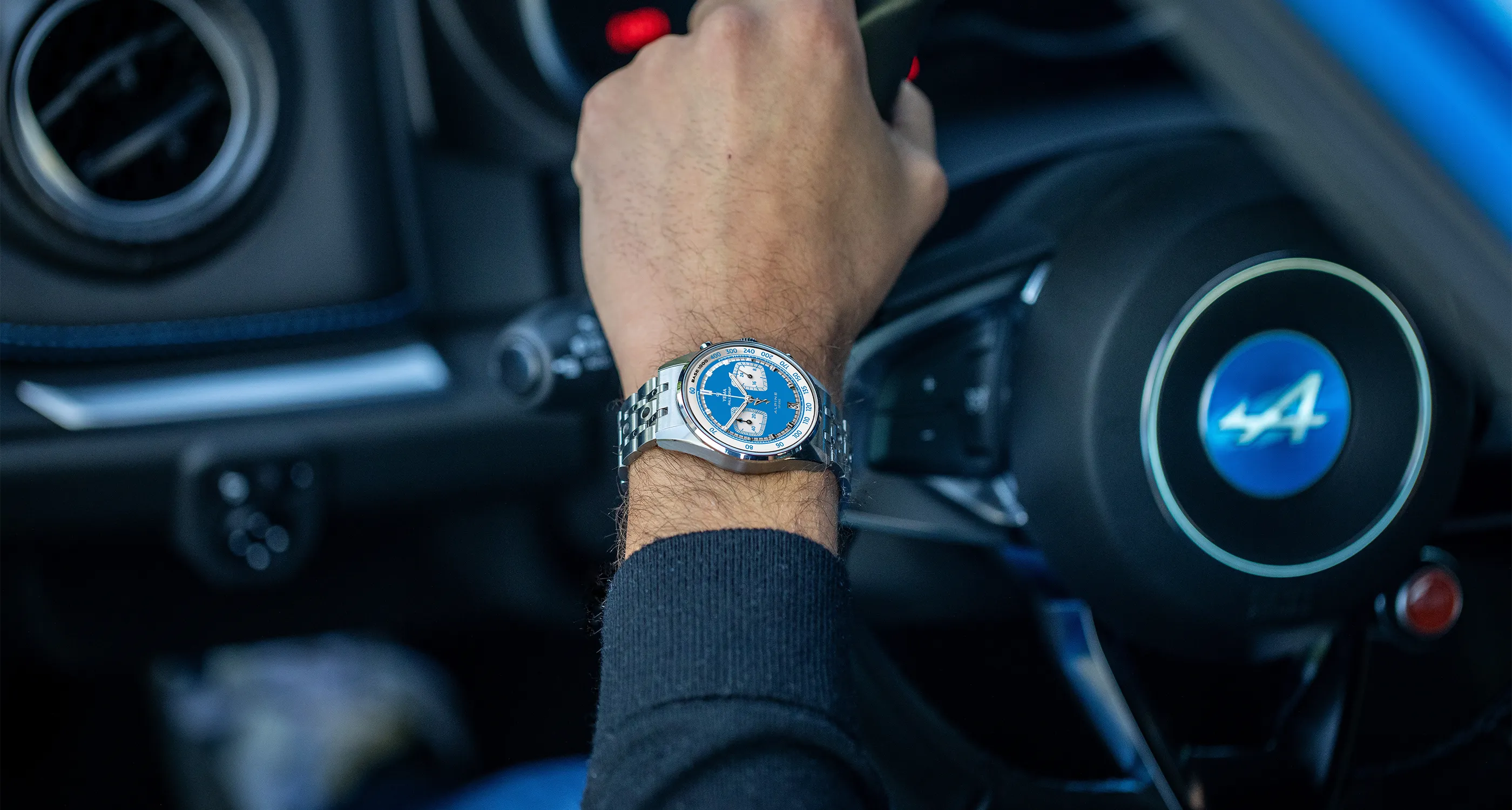 Questo design senza tempo non solo migliora la leggibilità, permettendo una lettura immediata di ciascun contatore, ma aggiunge anche profondità visiva ed eleganza sportiva. La data è armoniosamente posizionata alle ore 6, in equilibrio con il logo della Alpine Cup Series in alto, a sottolineare il tema racing. Da notare la punta blu Alpine della lancetta dei secondi centrali, che indica chiaramente la scala tachimetrica sulla lunetta.