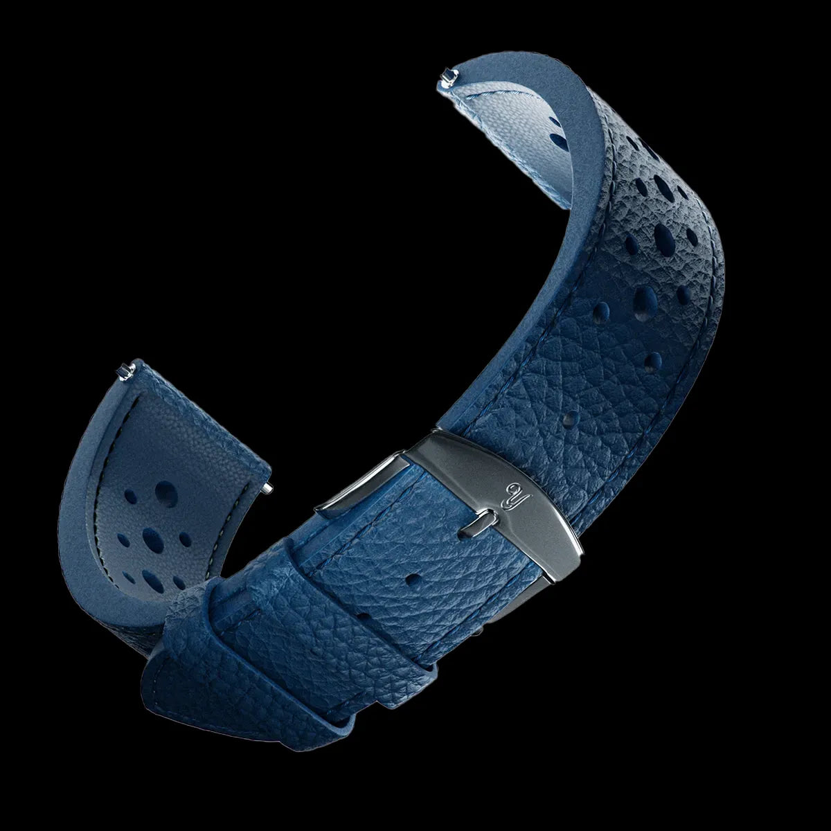Realizzato da una manifattura francese della nostra regione, il cinturino in pelle traforata e granulata in stile Rallye è stato appositamente progettato nei colori coordinati della Rallygraf.