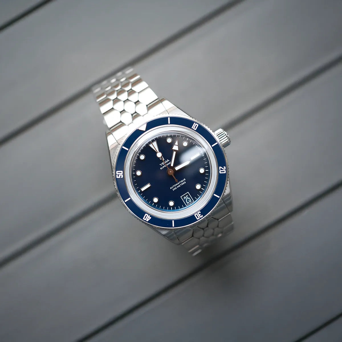 L’iconico bracciale YEMA Scales degli anni ’60 è stato alleggerito di 0,40 mm e ora si assottiglia progressivamente fino a 4 mm all’altezza della chiusura, adattandosi in modo naturale alla forma di ogni polso. La finitura completamente satinata conferisce continuità visiva ed eleganza, in perfetta armonia con la cassa in acciaio spazzolato.