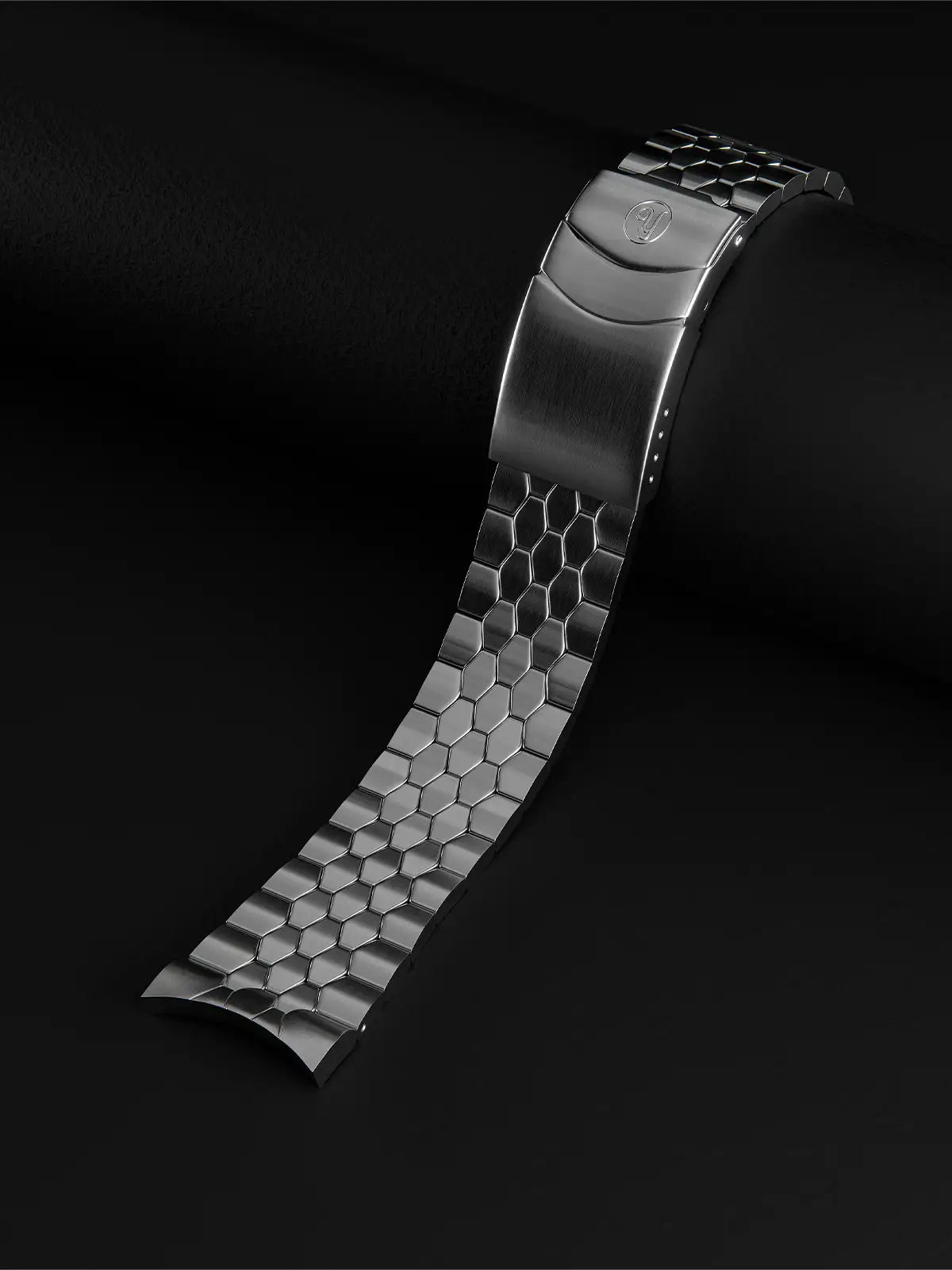 L'iconico bracciale YEMA Scales degli anni '60 è stato snellito di 0,40 mm in modo da integrarsi armoniosamente con la cassa sottile del Superman Slim.