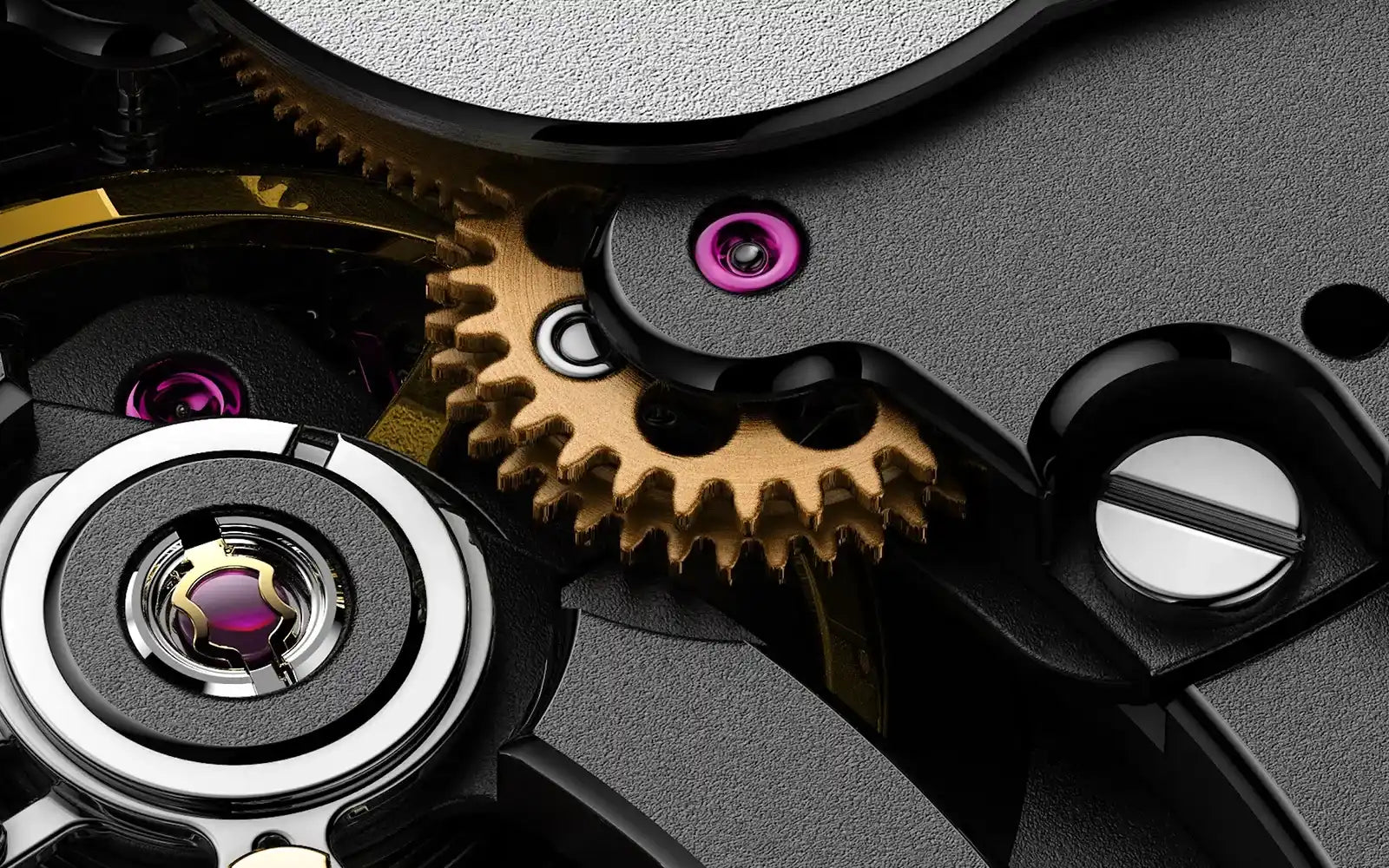 The CMM.10 was designed as an innovative, new generation, high performance caliber. In order to reinforce the contemporary appearance of the caliber we have opted for a modern and differentiating aesthetic with black galvanic decoration of the bridges and plate. The micro blasting treatment of the mainplate and bridges, applied with a sand blasting machine, results in a neutral, matt surface finish in contrast with the oscillating weight "gunmetal" finish. The uniform black galvanic coating preserves the decorative micro blasting finish of the surface.