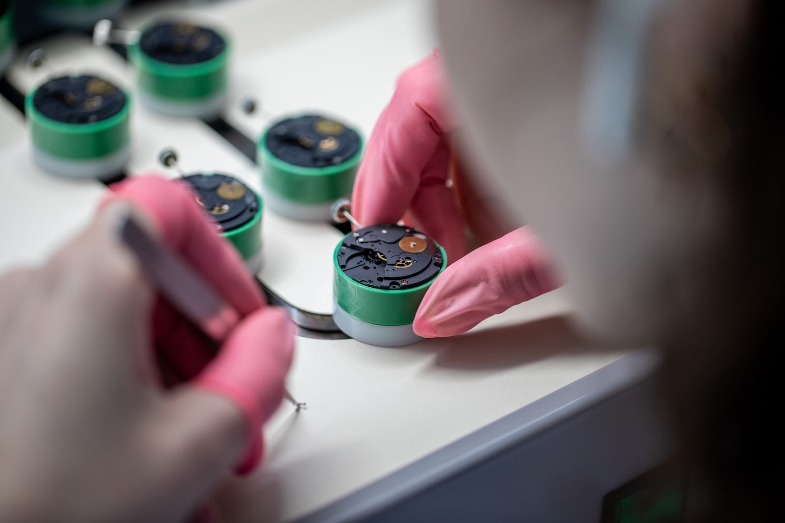 Synthetic rubies, feet, and pins are installed with micrometric precision using advanced driving equipment. These jewels are essential to reduce friction between moving components and ensure an optimal lifespan for the moving parts of the caliber.