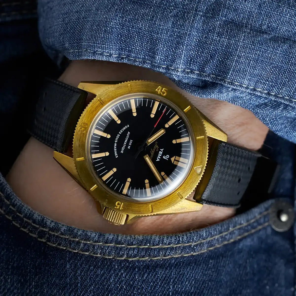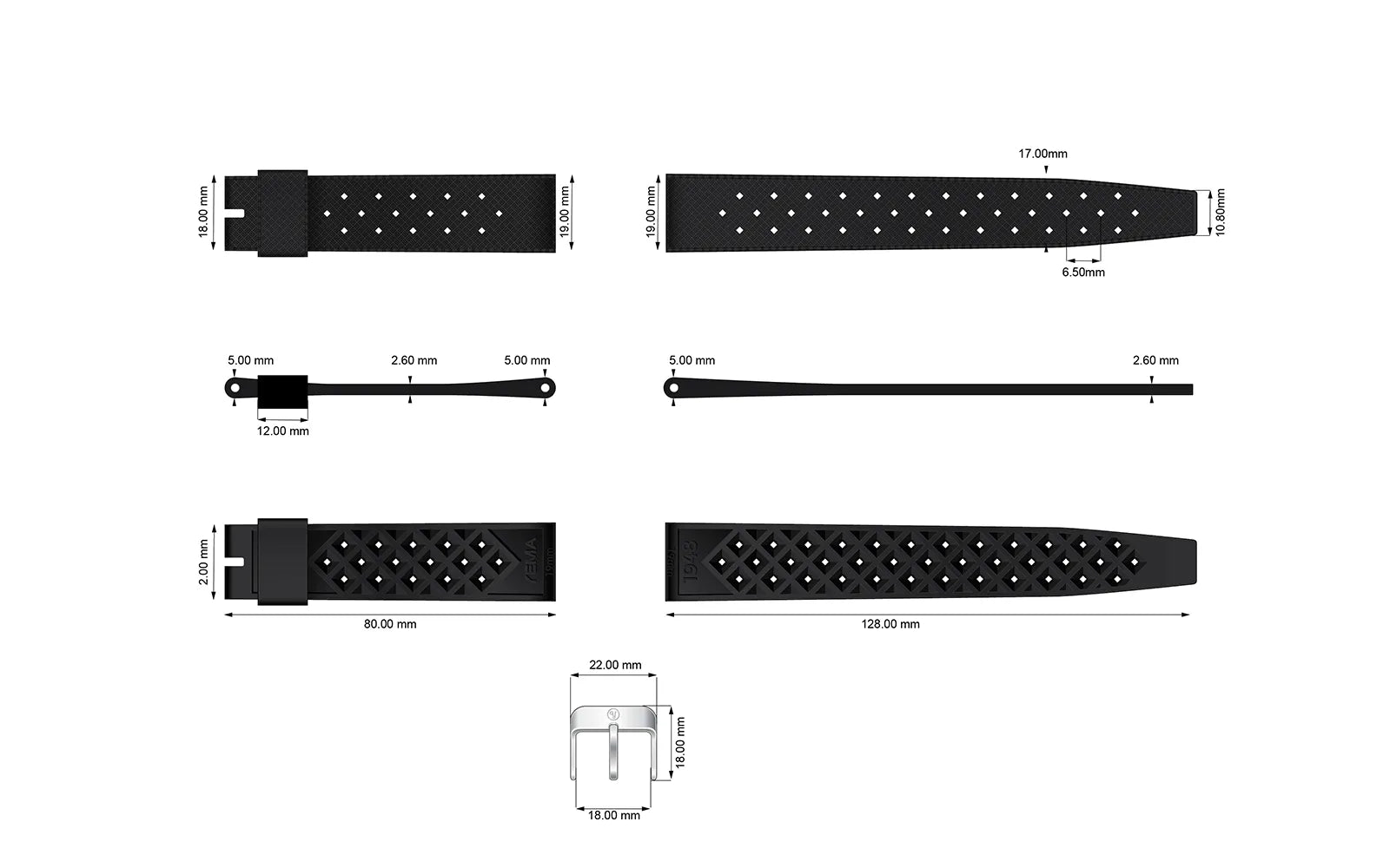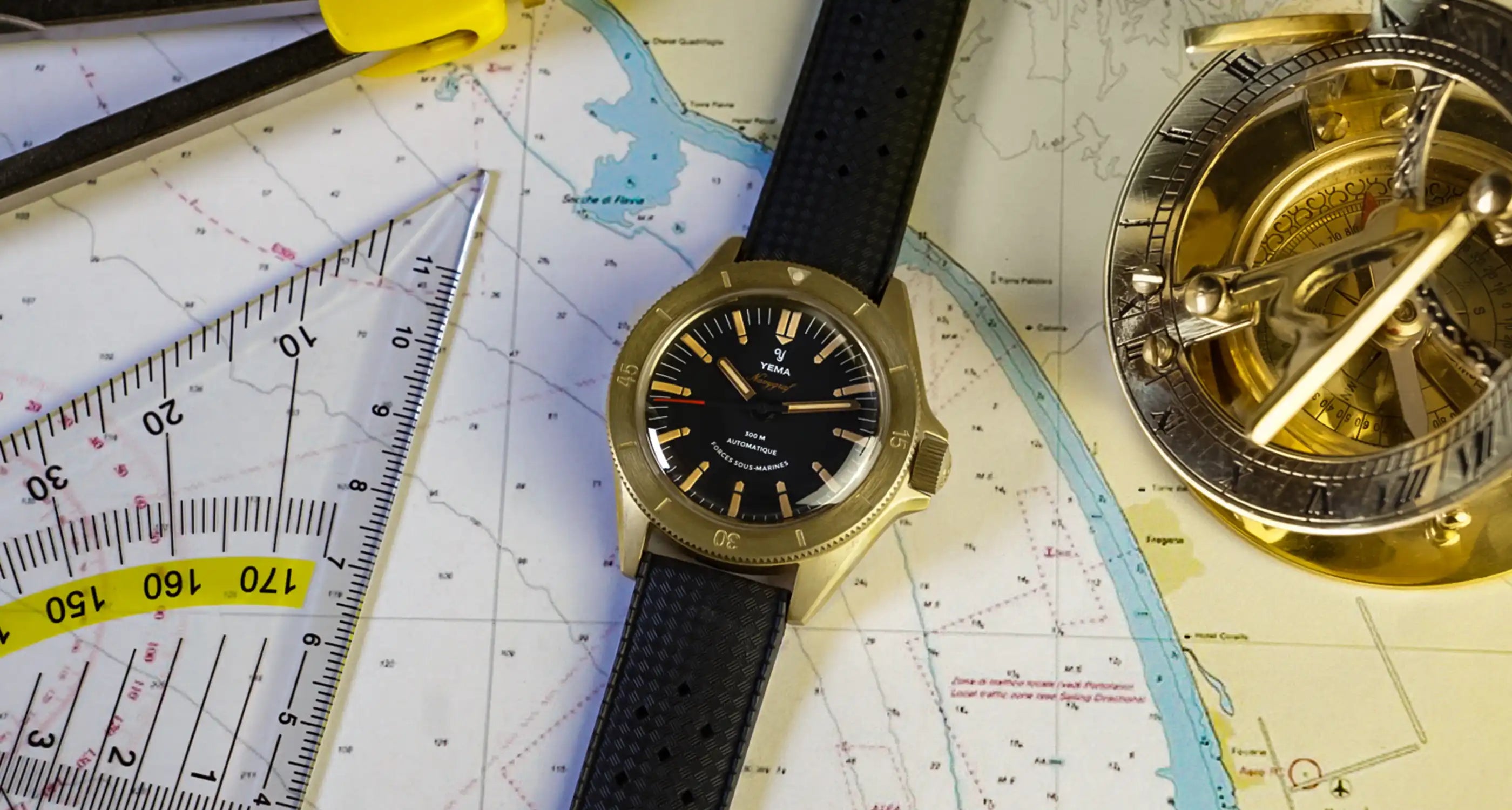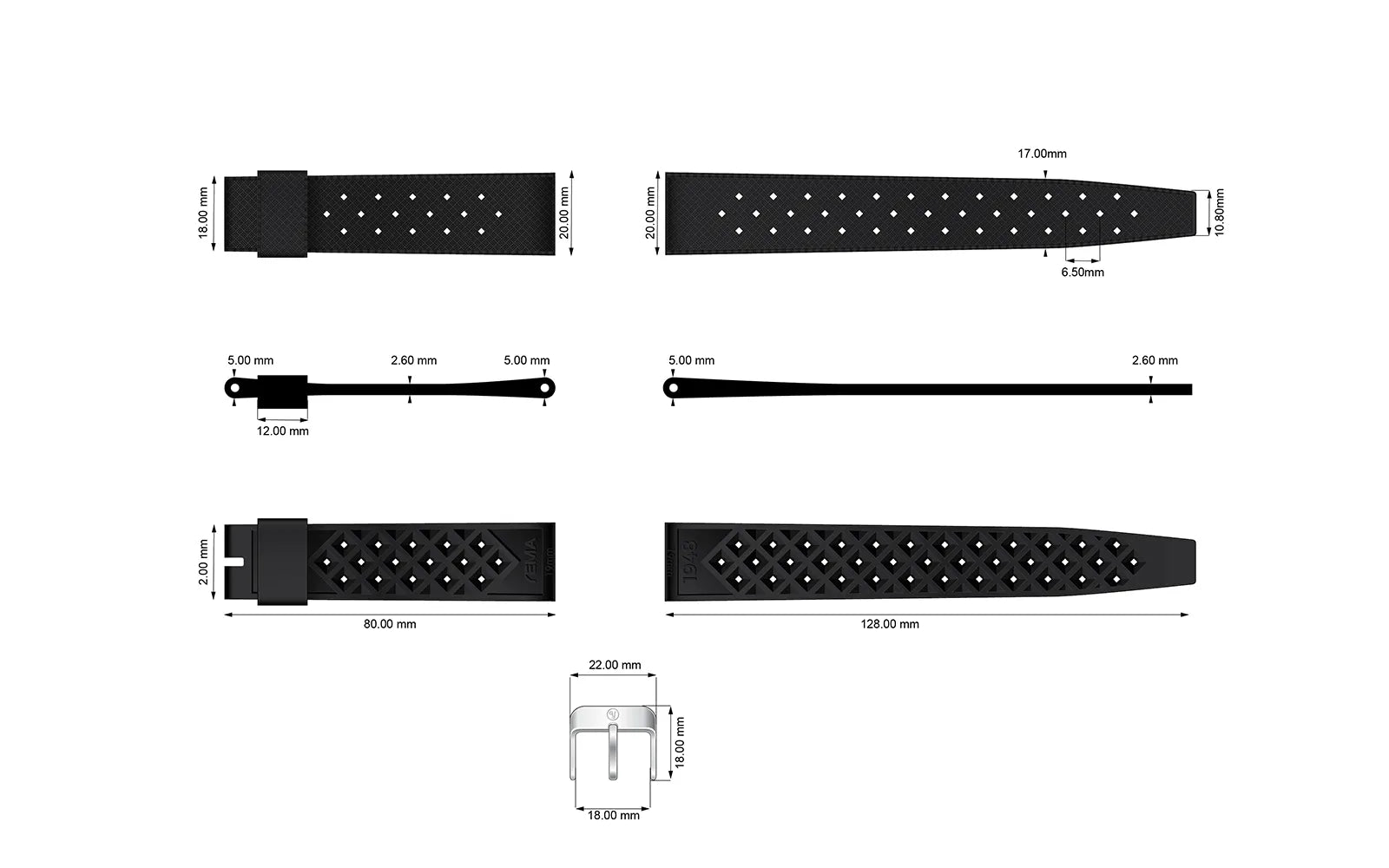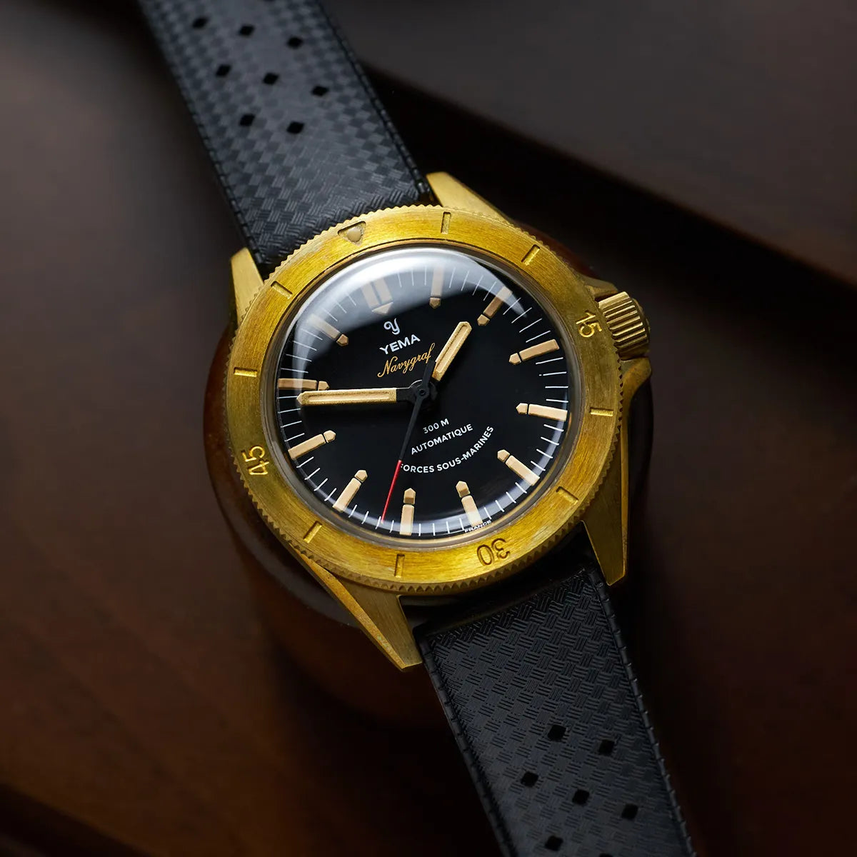 Inspired by the 1960's iconic rubber strap, YEMA's Rubber straps are made from TPU (Thermoplastic Polyurethane), a rubber-like material extremely flexible, durable and smooth to the touch, making of it the ideal strap for divers due to its resistance to saltwater, sun, and extreme temperatures. Its unique design features a raised, waffle-like pattern on the underside, providing superior breathability and preventing the strap from sticking to the skin.