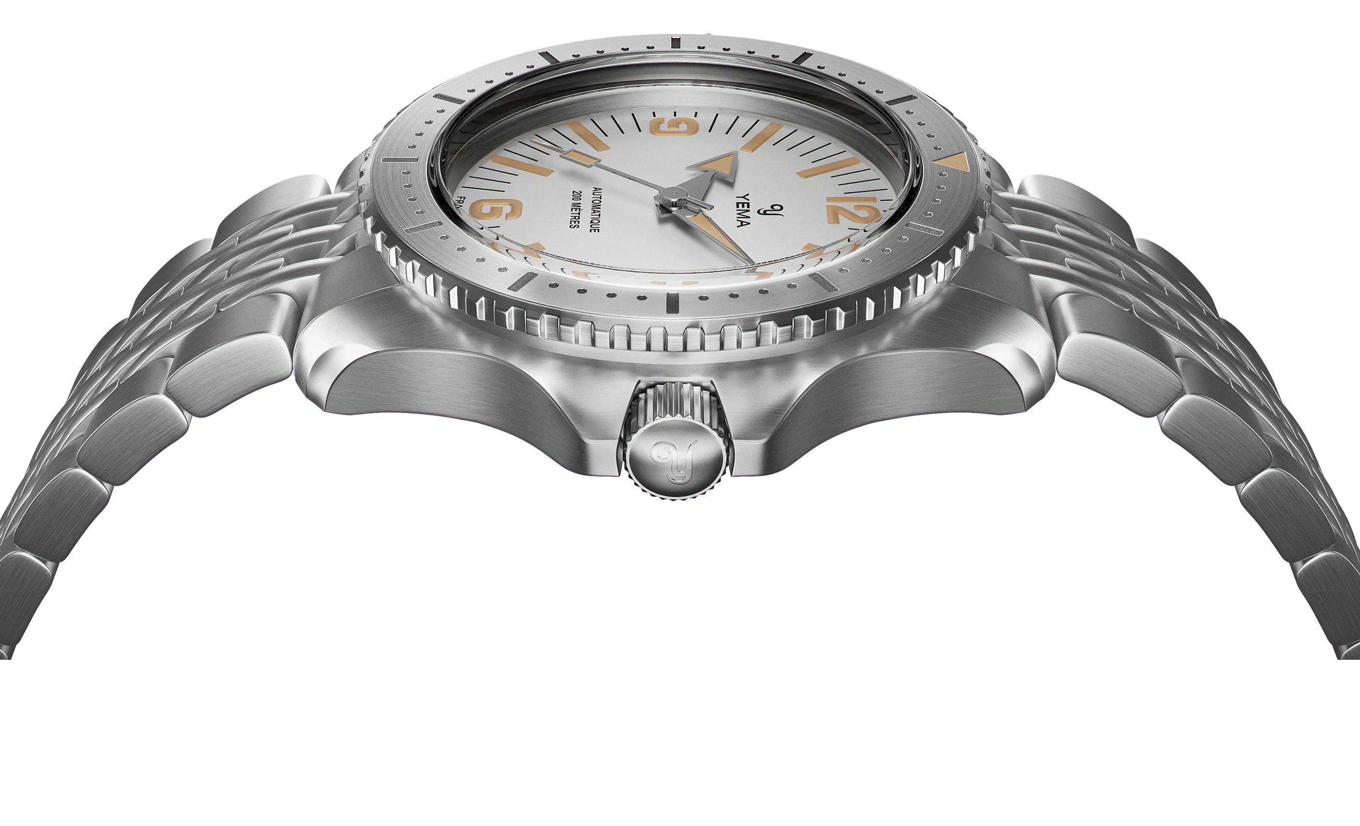 The 316L stainless steel case back features YEMA's historic coat of arms, stamped with a hydraulic press in polished & brushed finish. Equipped with a screw-down crown, the YEMA Diver is waterproof to 200m and combines rugged functionality while offering a nod to neo-vintage enthusiasts.
