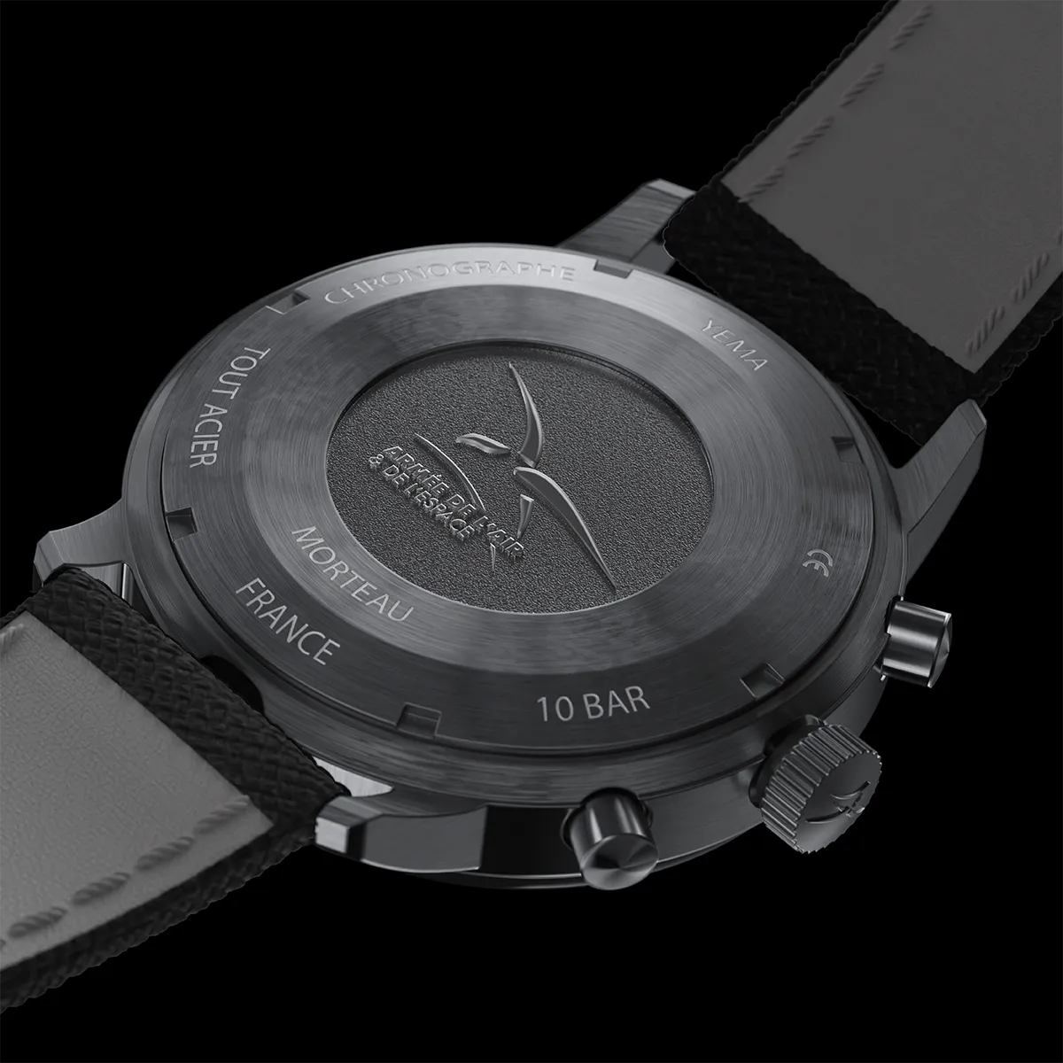 The 316L stainless steel caseback features French Air Force logo embossed with a hydraulic press.