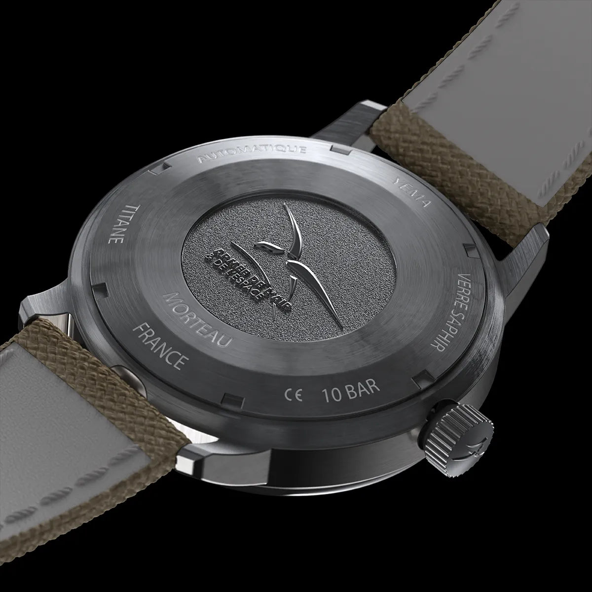 The titanium caseback features French Air Force logo embossed with a hydraulic press.