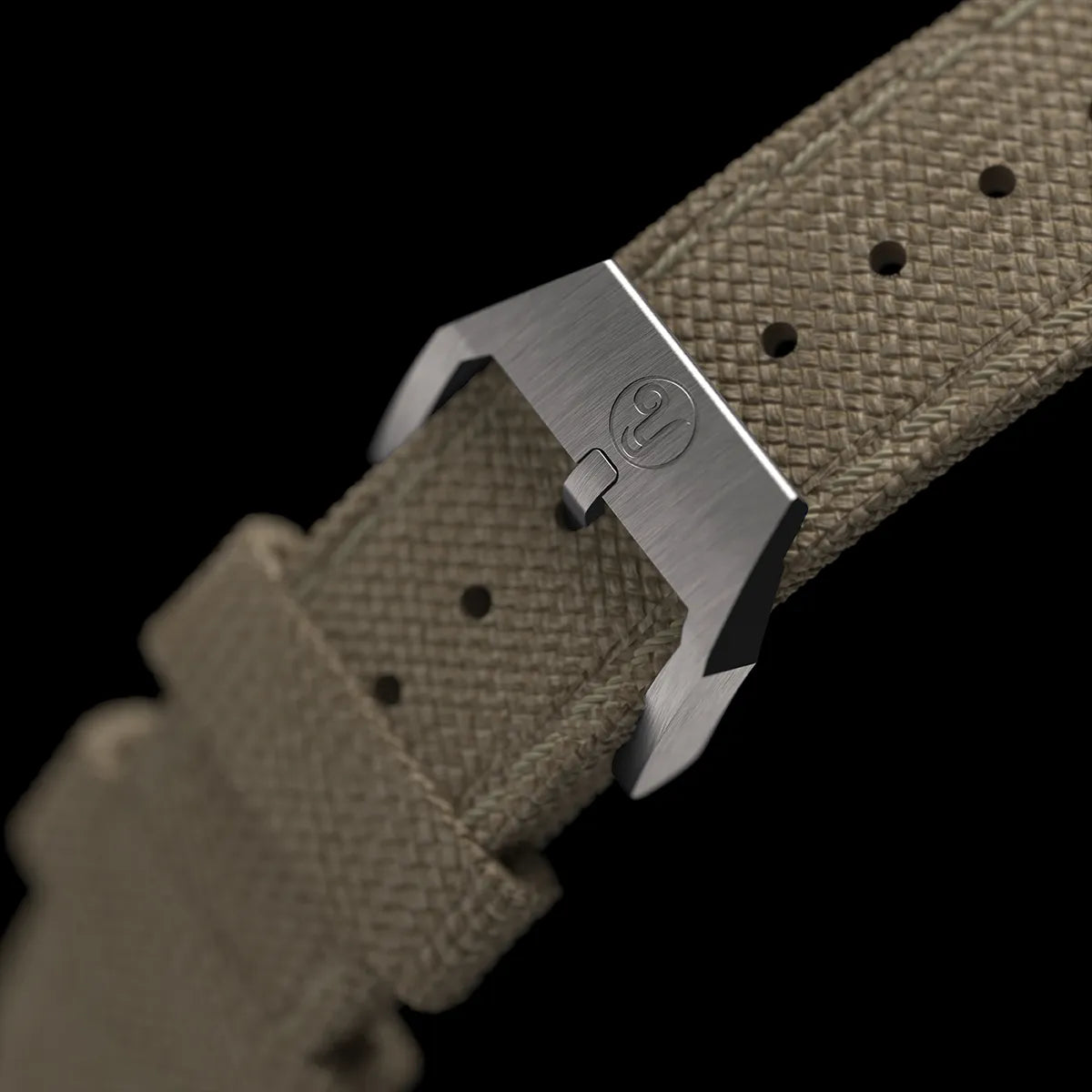 The Grade 2 titanium case (40% lighter than steel) benefits from better resistance to shocks and corrosion. The darker hue of titanium, combined with the case's sandblasted matte finish enhance the overall military look and feel. The 40mm titanium case (46mm lug to lug) combined with a thickness of less than 10mm results in a relatively thin case with contained proportions that perfectly fits all wrists while providing a pleasant dial opening and wearing comfort.