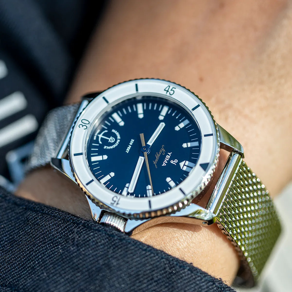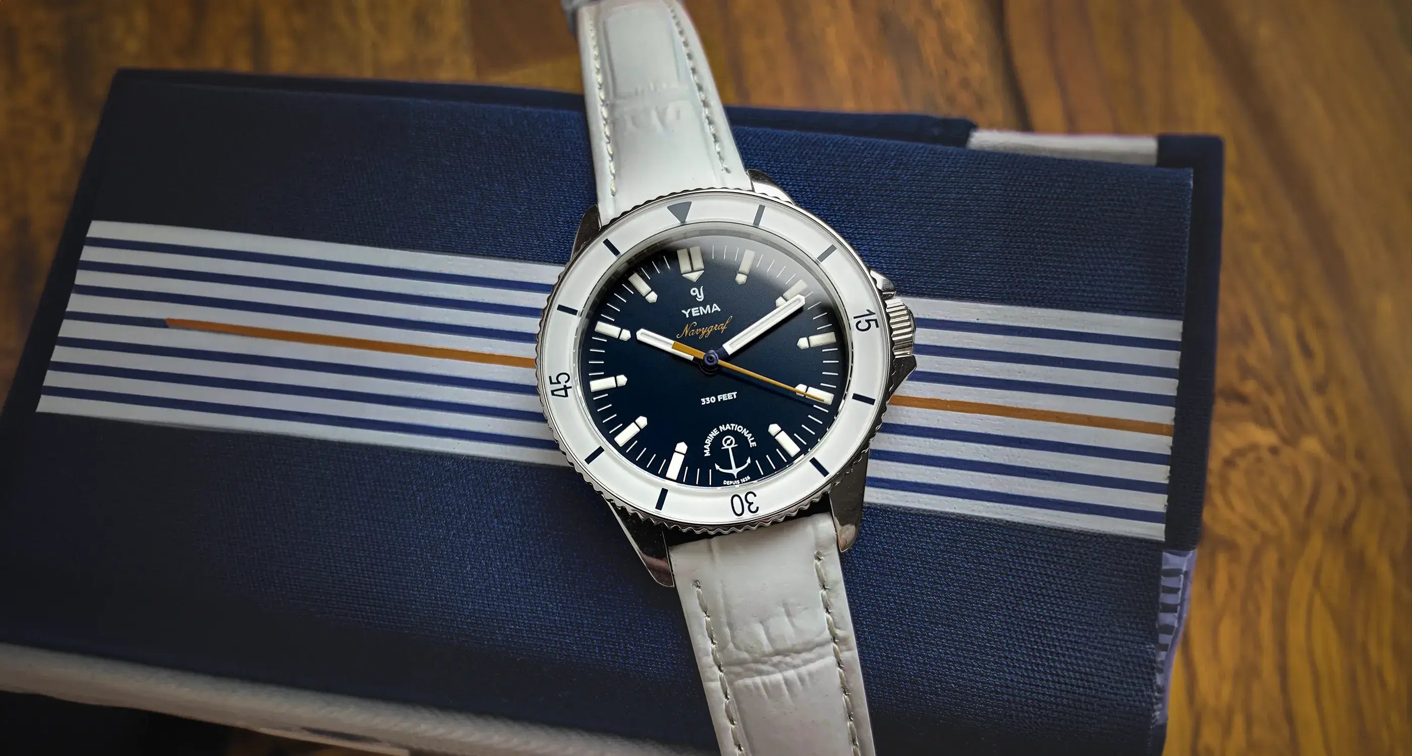 The iconic markers are shaped in the form of an exclamation mark, a distinct signature of the 1970's vintage Navygraf model. The matt blue dial and the golden Navygraf mention, proudly display the Marine Nationale official colours along their logo 6 o'clock.